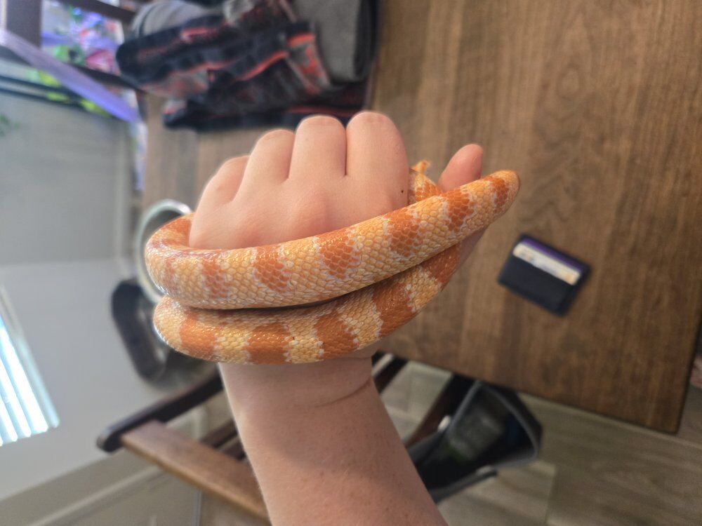 Venmo4 year old cornsnake. gender is unknown, but the snake is healthy. I get a clean shed every 3 to 5 months. I feed 1 adult mice every 7 days.