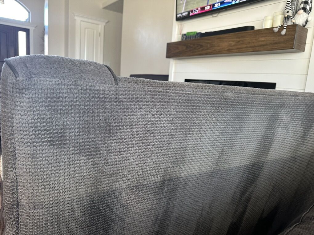 Some of the cushion covers have some punctures from our dog, but no major tears (shown in pictures). The loveseat has some sun fading which is also shown in the pictures.