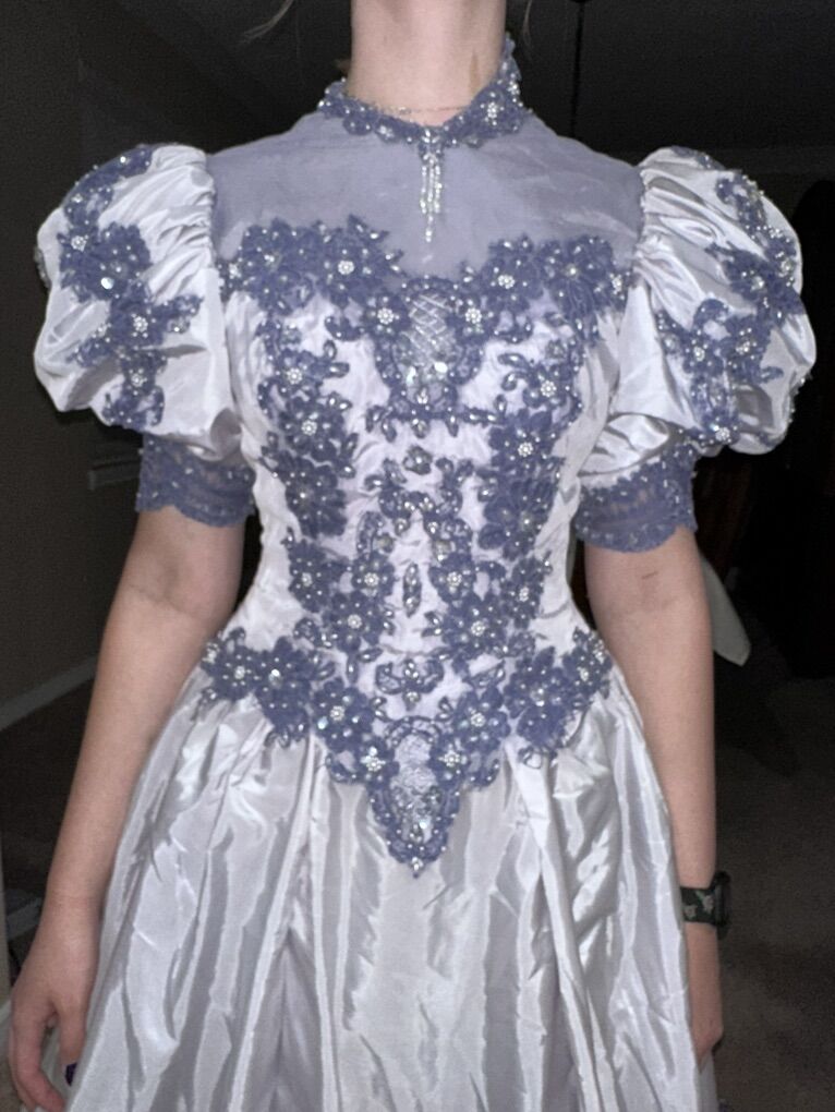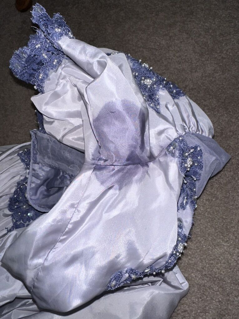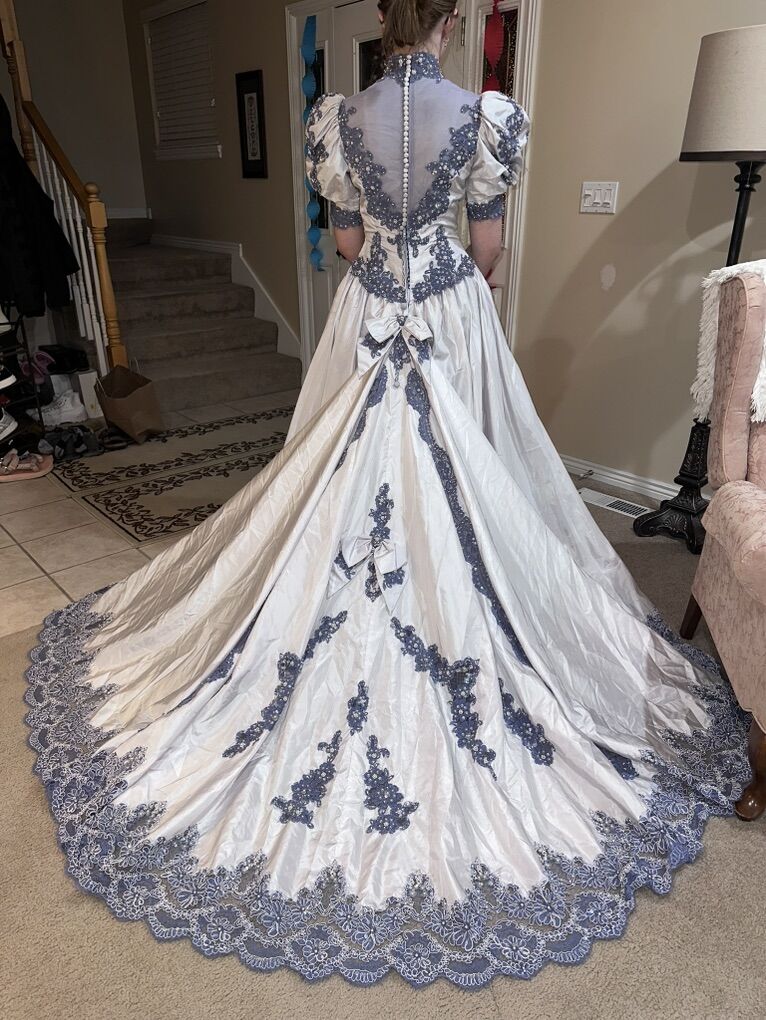 VenmoGood condition for the most part (lace and sequins have wear). I purchased it with the intention to do a haunted mansion bride costume, I just no longer have the space for it in my closet. The original owner got a little sweaty, so this dress will need to be cleaned. The very faded label says size 10, it is NOT a 10. I am a size 2-4, and it fits me like a glove. It does have the option to shorten the train by buttoning some of it as shown in the second image. The back is also 100% buttons, the waist has a small zipper, but other than that it is all real buttons.