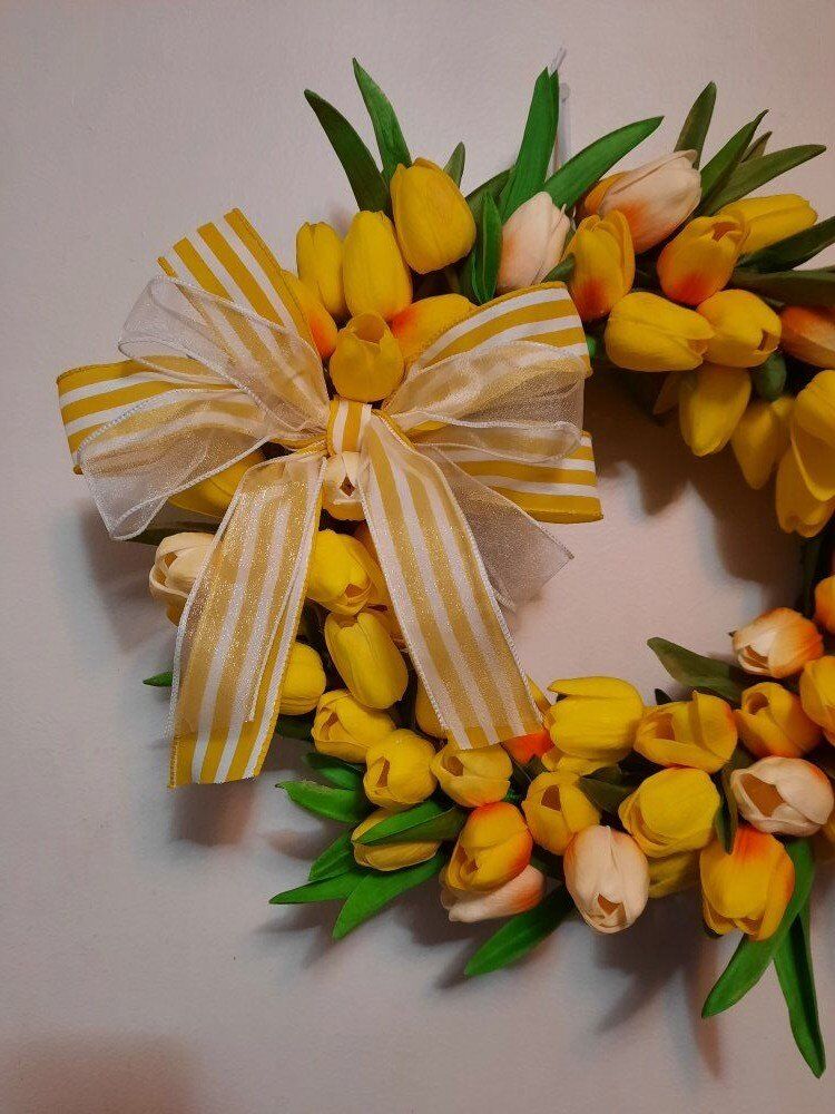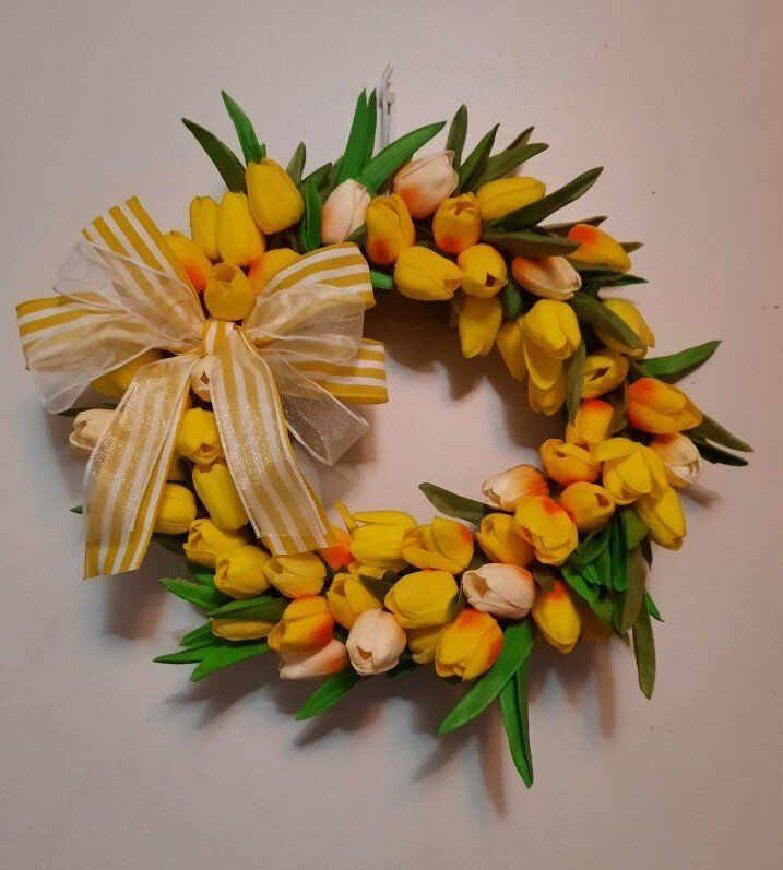 VenmoThis handcrafted tulip wreath would be a beautiful addition to your front door! Get ready for Spring with this bright and cheery tulip wreath. It is handcrafted with realistic looking and feeling florals and accented with a pretty matching bow.