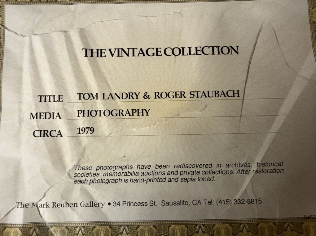 VenmoFramed sepia-tone photograph of Dallas Cowboys coach Tom Landry and QB Roger Staubach. This is a restored archival reprint from The Vintage Collection (Mark Reuben Gallery), framed professionally in 2004.