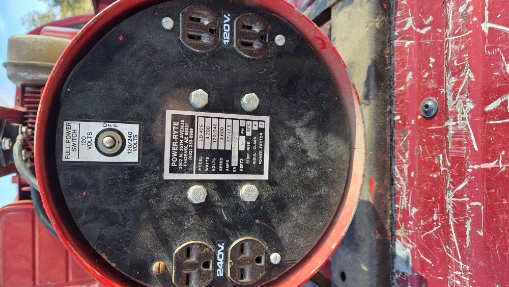 I got this generator in a package deal and I don't wish to keep it. The tag states it is a 4200 watt unit and is powered by an 8 horse Briggs And Stratton engine. I haven't messed around with it much but it does fire easy. I just haven't been able to get it to idle yet. Too many other projects so not interested in spending much time on it. It has a functional pull cord as well as electric start. Mounted on a small rack. Some fresh gas in the tank included.
