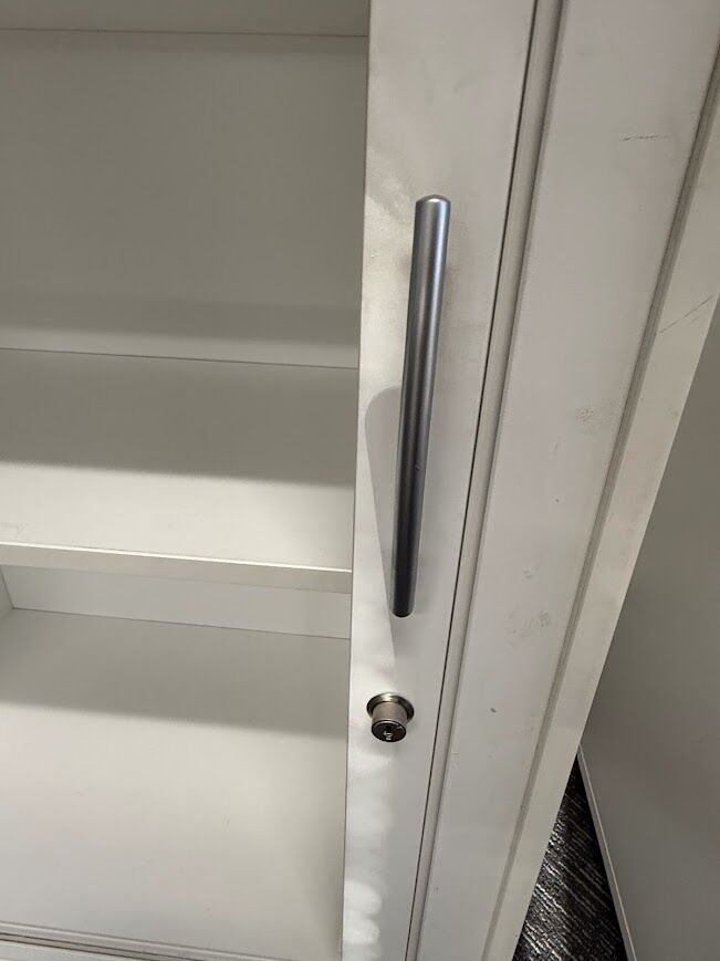 White finish with silver hardware. Fully functional. Dusty from being in storage and will need a good cleaning, otherwise in great condition.