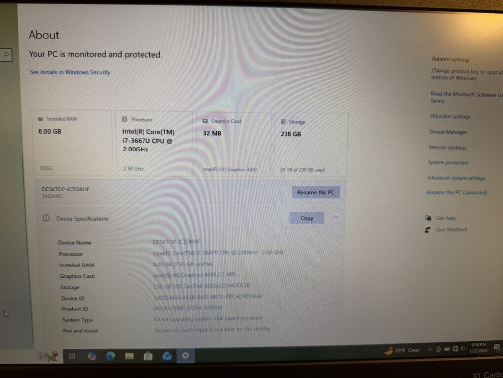 ApplePayLenovo Thinkpad X1 Carbon i7 8GB Ram 250SSD Win 10
