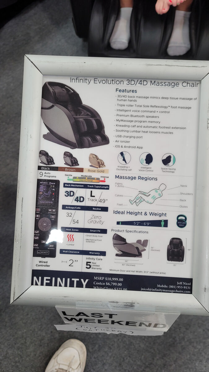 VenmoWonderful massage chair. Infinity Massage Chair. This is the Cadallic of Chairs. It is much better than others. It has 4 different types of massage. It was worth the $6,800 paid for at Costco. It is the best of the best. Works like new. Powerful and programmable. New at Costco $6,800 - Asking $2,750- Steve 801.822-2086