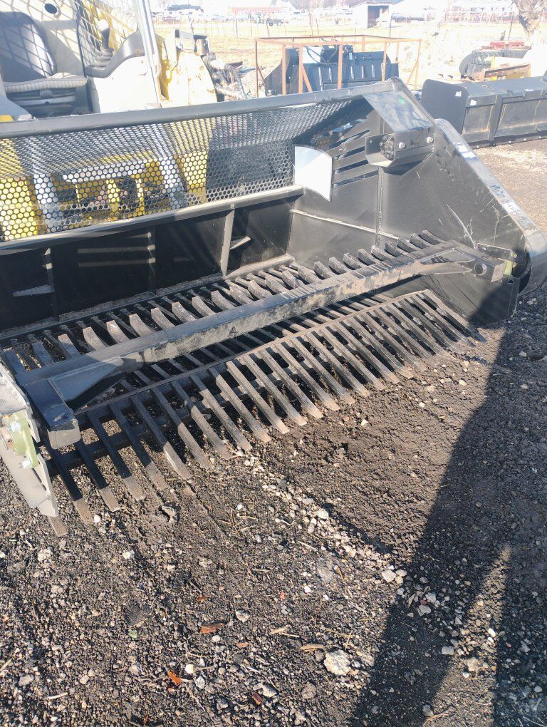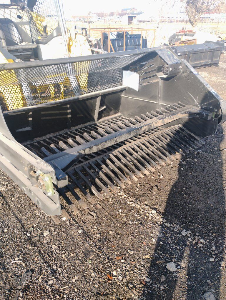 Venmo84 in brand new hydraulic rotating arm Rock picker these things work great for picking up rocks out of loose soil hard soil as it'll dig in with the tines the rotating grapples that knock the rocks into the bucket then we'll screen it out 2 in and larger it'll keep in the bucket good for arenas good for landscapers these are hard to find delivery possible thanks
