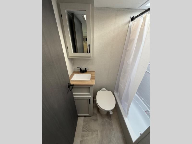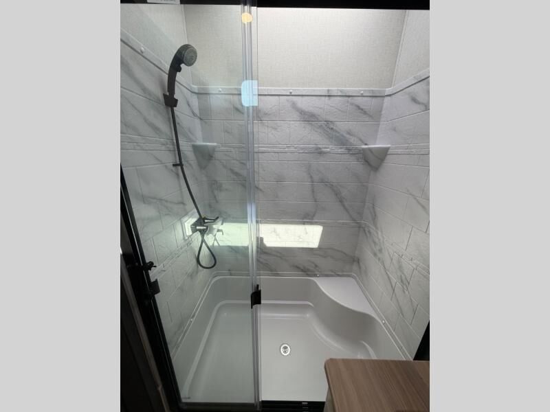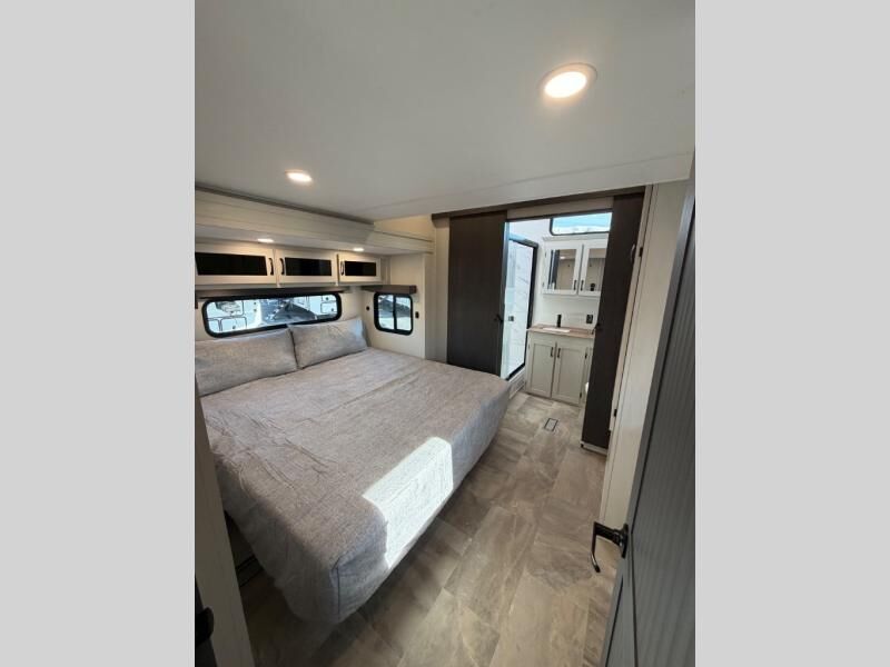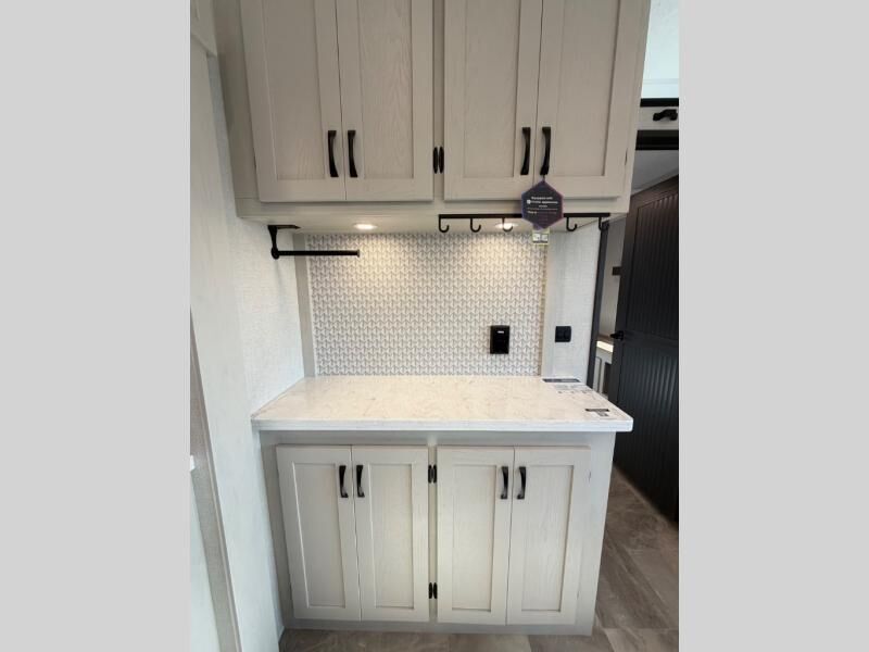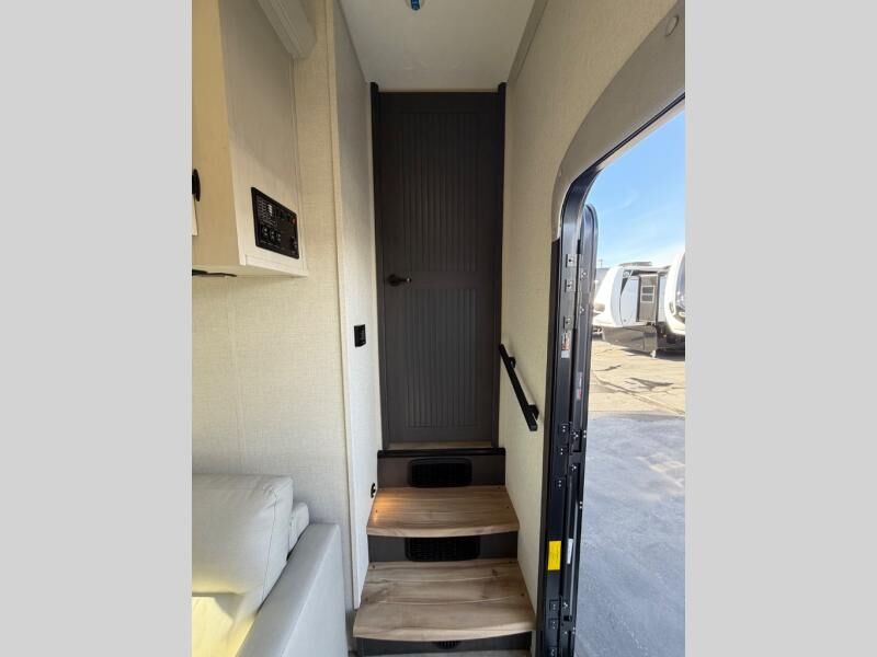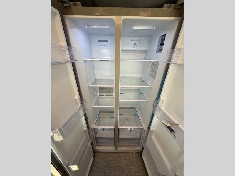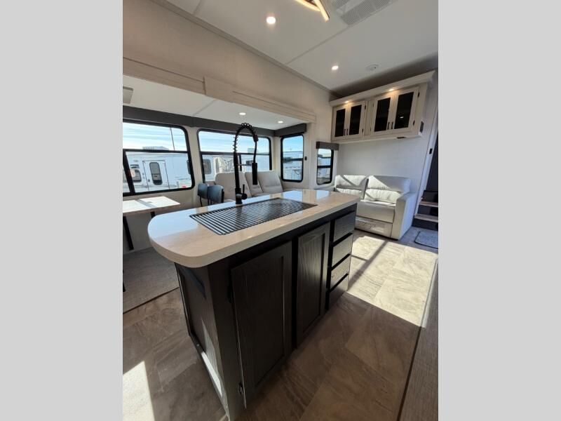 One look at this fifth wheel and you'll be sold! There are an impressive two master suites; one up front with a queen bed and full bath, and one towards the back with a king bed slide and second full bath! There are even dual bath sinks in the rear bath for added convenience! The middle living area includes dual opposing slides, a tri-fold sofa, plus theater seating and a free-spanning table for ample seating, dining, and sleeping space. There is also an entertainment center with a 50" 4K Smart LED TV to wash away those rainy day blues. The chef of your crew will have a GE Profile 21" stainless steel oven with a residential cooktop and a GE Profile stainless residential microwave to cook meals each day, a kitchen island for more counter space, and a 16 cu. ft. side-by-side 12V refrigerator for food storage.
