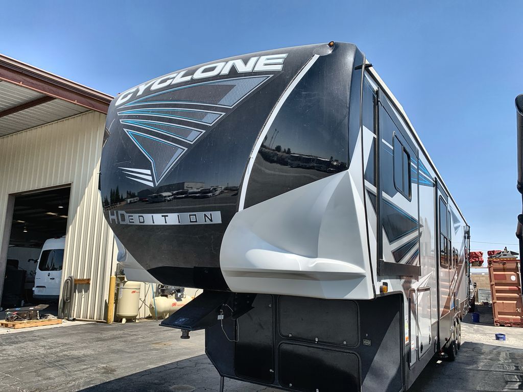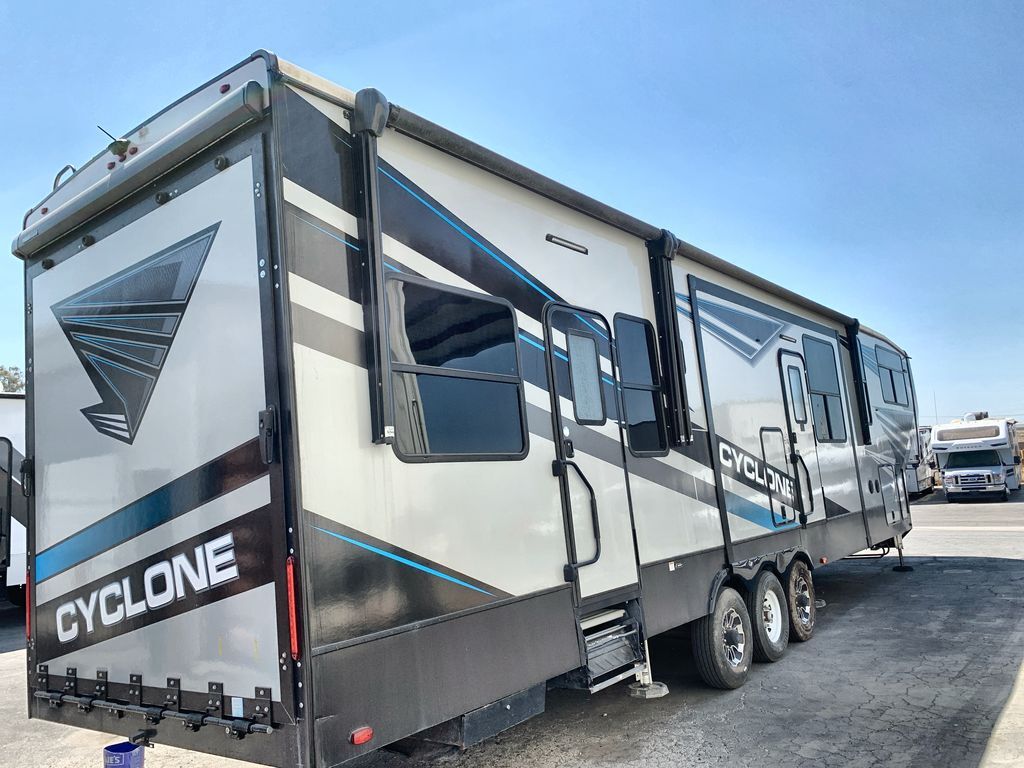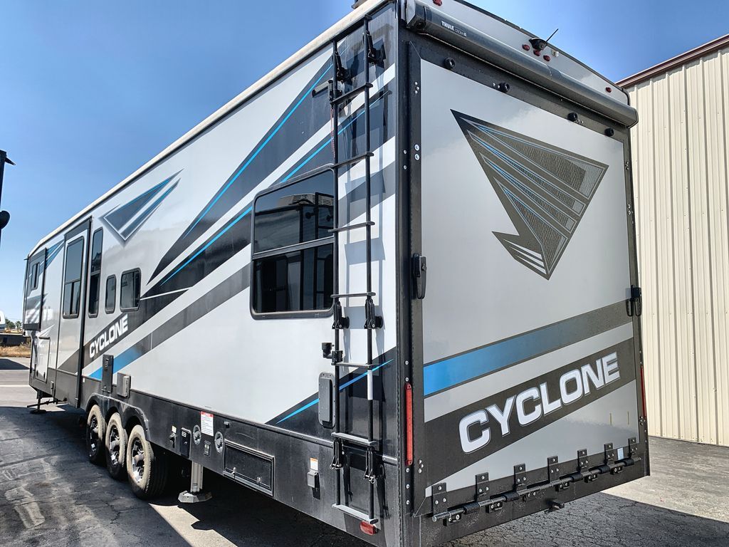 Heartland Cyclone toy hauler 4006 highlights: Loft Dual Entry Doors Bath and a Half Front Master Suite Outside Refrigerator Everyone will have a comfortable place to sit in this toy hauler with the dual opposing theater seating slides and the third theater seating across from the 50" LCD HDTV! The 3,000 lb. weather resistant 8' ramp door makes it easy to load your toys into the 13' garage and then unload them once you have arrived and set up the electric queen bed above the split bench seating, the loft, the half bathroom, and there is even an area prepped to add an optional washer and dryer. There is plenty of countertop space in the U-shaped kitchen to prepare your best home cooked meals, and you even have an outside refrigerator to enjoy a cold beverage underneath the two awnings! Satisfy your wanderlust with a Heartland Cyclone fifth wheel toy hauler! You won't have to sacrifice any luxury either with indulgent features like the king bedroom suite with a "swift space" work station that pulls out from the dresser, a Stor-Mor three-sided access to the basement with 30% more storage capacity, and Step Caddy folding patio step for better stability as you enter or exit the patio. The industry first Grill and Go 25" residential pull out 3 burner griddle combo comes on models with an exterior kitchen for an easier cooking experience. Full height shaker cabinetry provides 25% more storage space so you can bring more camping necessities with you. If you like to dry camp longer then you will appreciate the industry's largest 150 gallons fresh water tanks. Come find the perfect model for you today!