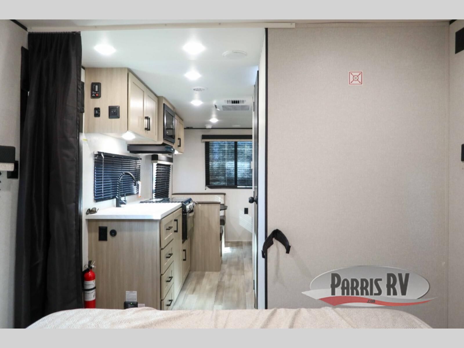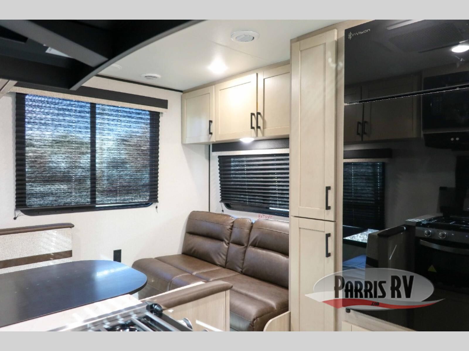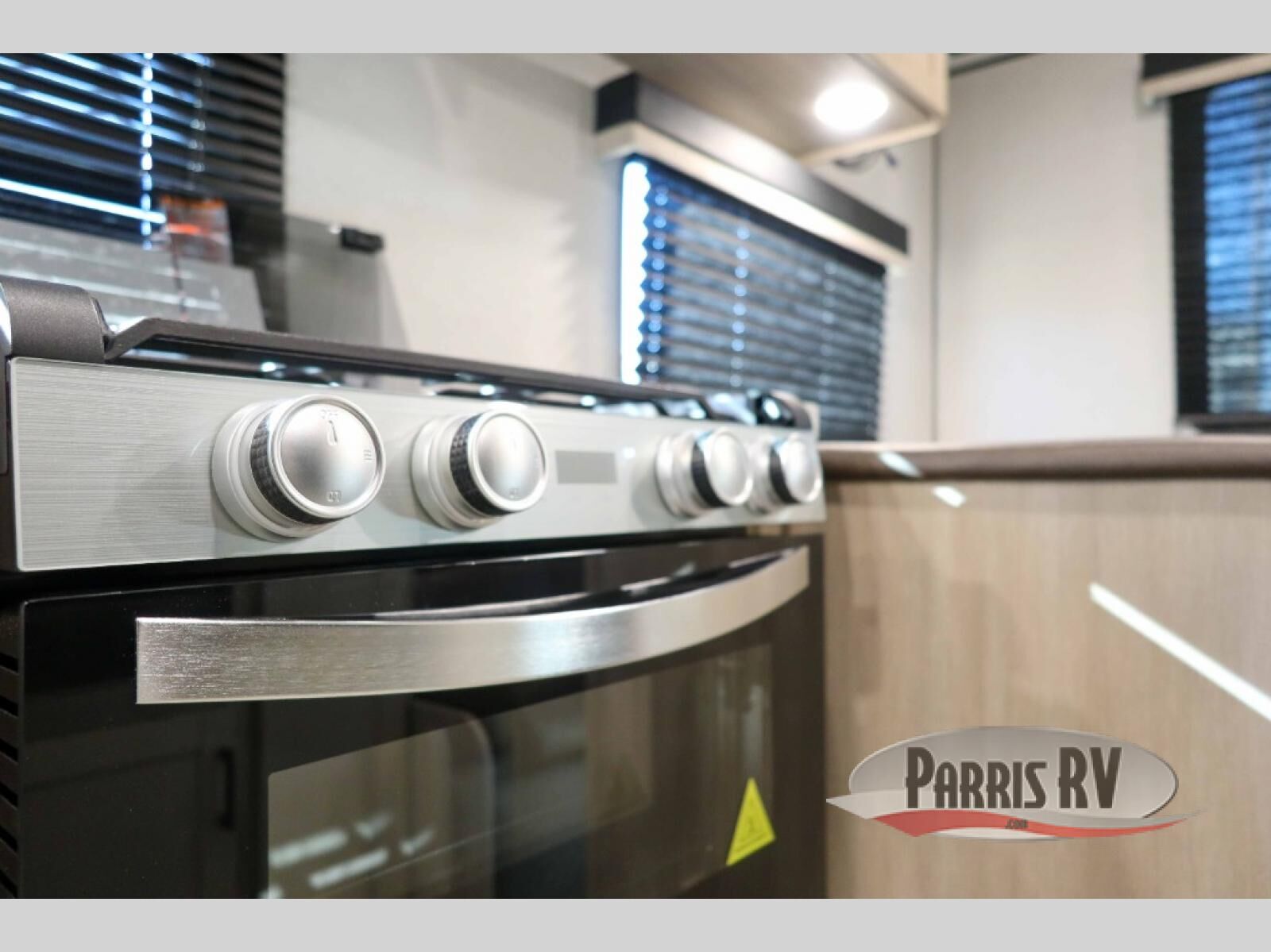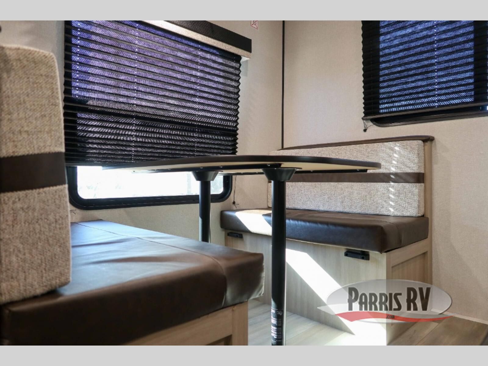 Weekend trips to the campground will be made unforgettable in this travel trailer for five to six. You will enjoy your own space in the front bedroom with a privacy curtain, RV queen bed and dual bedside wardrobes to keep your things tidy. If you have any guests staying over, then can convert the jack knife sofa and booth dinette back into seating spaces for breakfast in the morning. Speaking of breakfast, you'll have a three-burner cooktop and microwave oven to cook eggs and bacon, plus an 8-cu. ft. 12V refrigerator and pantry for food storage.