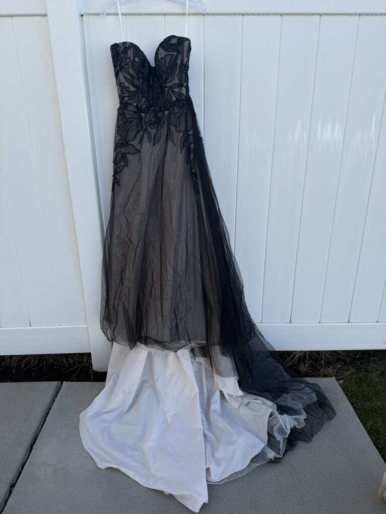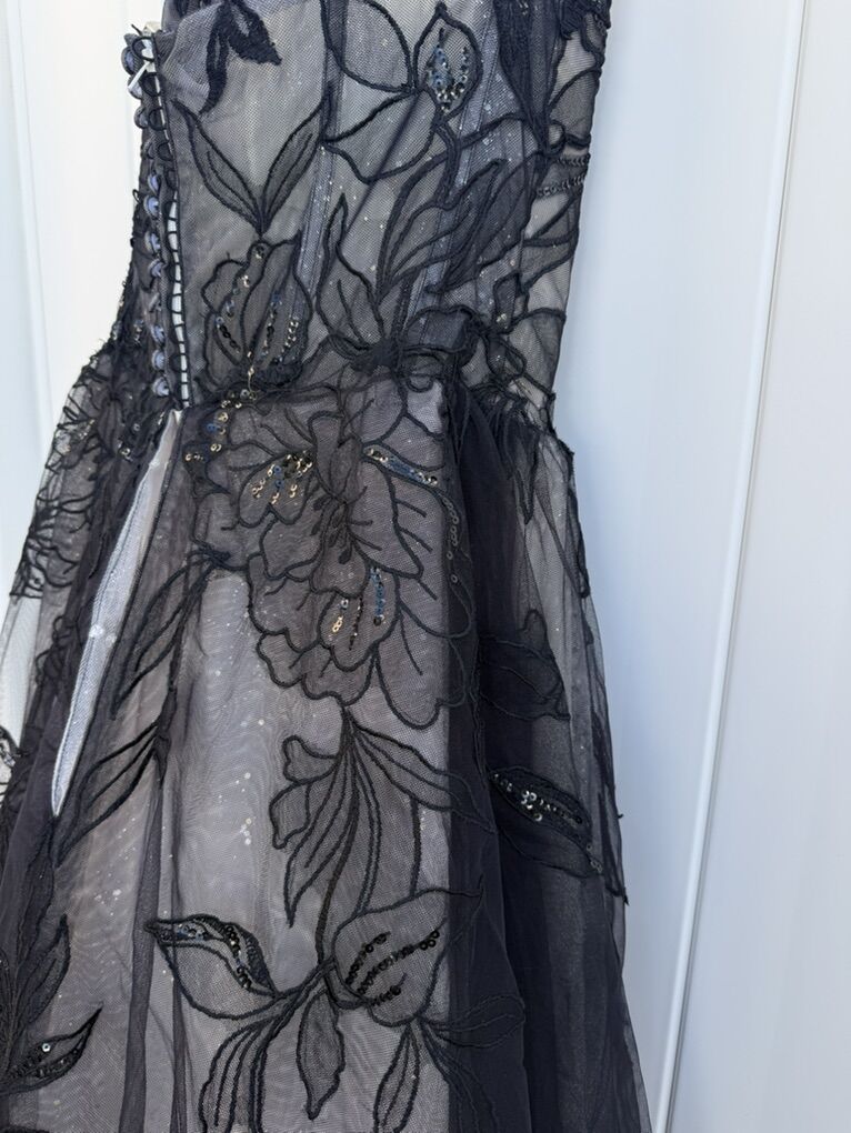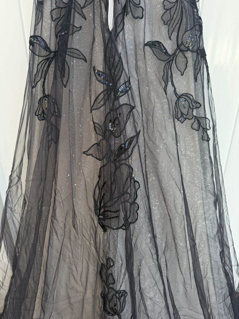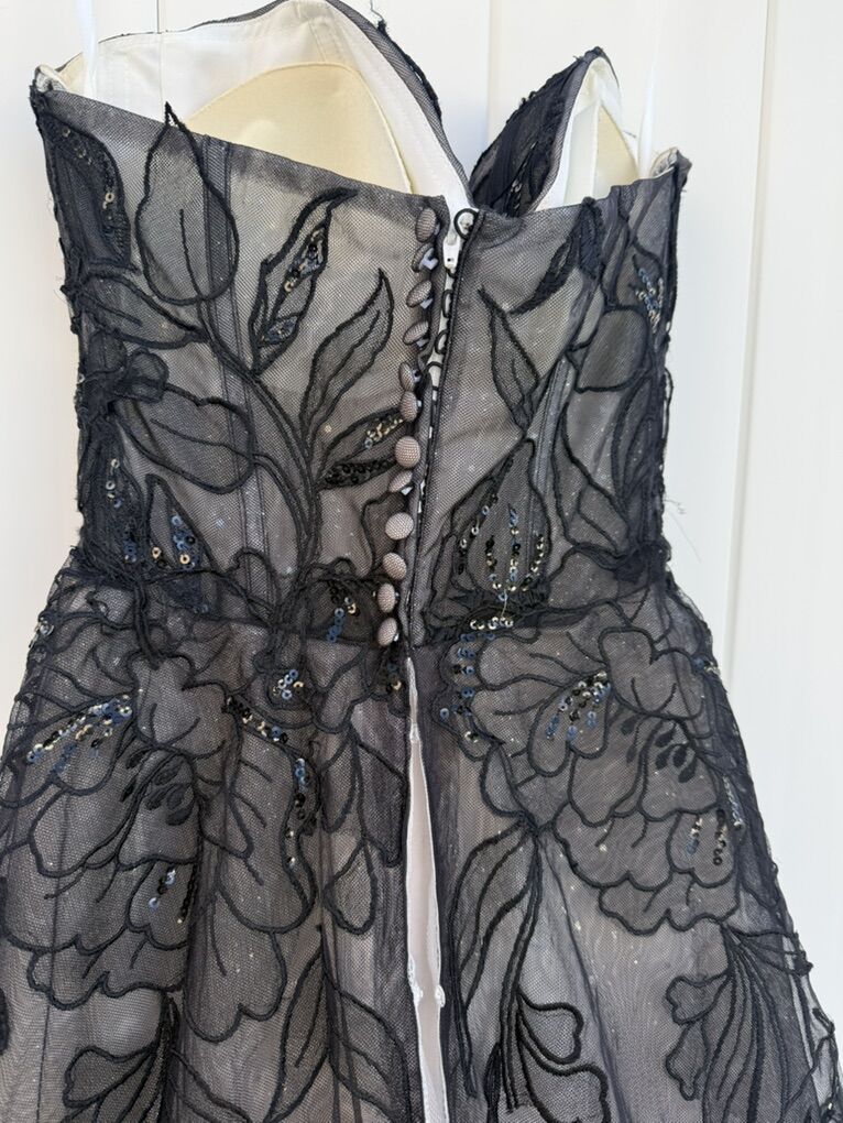 ApplePayBeautiful black lace wedding dress with hand sewn flower appliqué flowers down the back and on the bodice. Size 10.