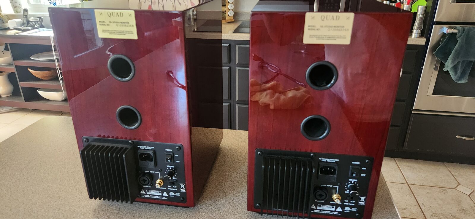 Each speaker has a built in Class A/B 60W amp for the 6.5" driver and 40W amp for the 1" tweeter. Accepts RCA or XLR inputs, adjustable volume and overload protection (which I have never needed). The speakers are in excellent condition and the gloss black finish is blemish free. I ran these via the balanced and RCA inputs with excellent results. The only reason I'm selling is because I'm running a newer pair of Quad S2's.