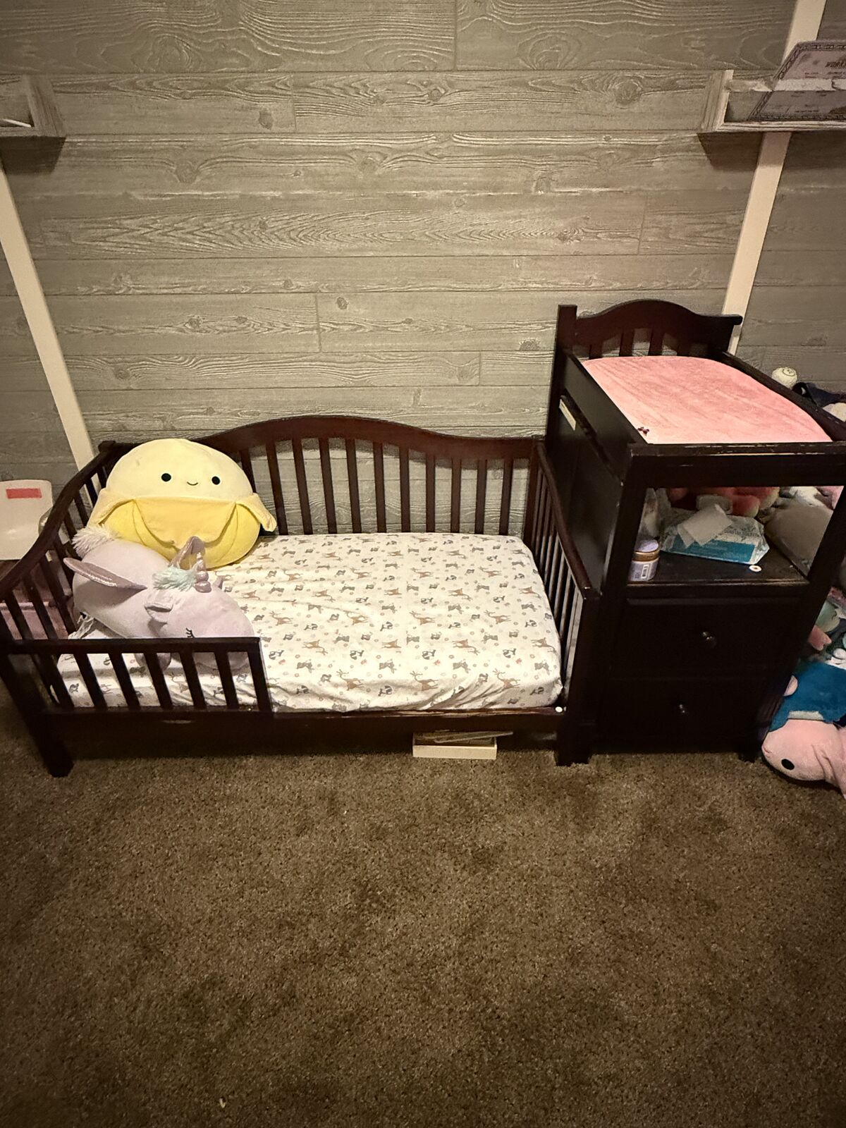 This crib has a changing table attached and then converts into a toddler bed might need a little touch up but other then that it's super solid if interested or have any questions please text or call 801-707-2184 no Scammers