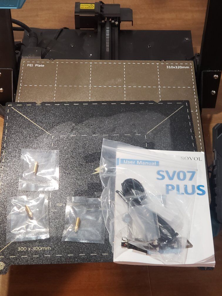 Sovol SV07 Plus larger format printer. Great condition, maybe 200-300 total hours print time. Includes extra .04mm nozzles, PEI spring steel smooth/textured build plate in addition to the double sided stock textured build plate, and an extra magnetic backing pad and flexible build plate. Includes original documentation and parts in parts drawer. This is the link to the printer specs on Sovol's website. https://www.sovol.tech/products/sovol-new-sv07-plus-larger-klipper-fdm-3d-printer