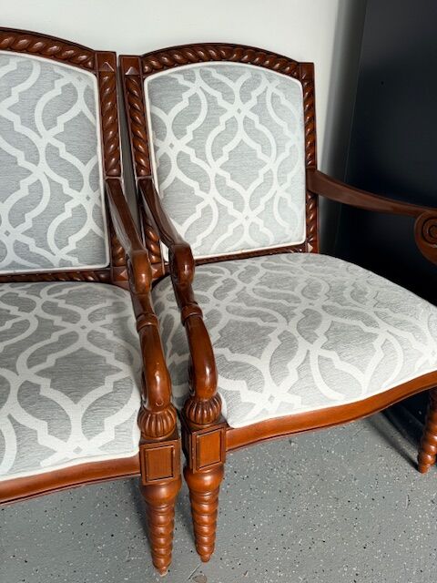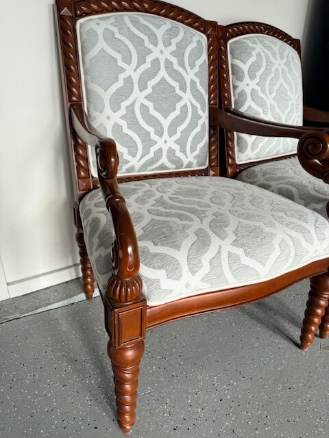 Two Bombay Company armchairs for sale. They have carved wood frames and have been upholstered in a modern grey/white fabric that is in excellent, clean condition.
