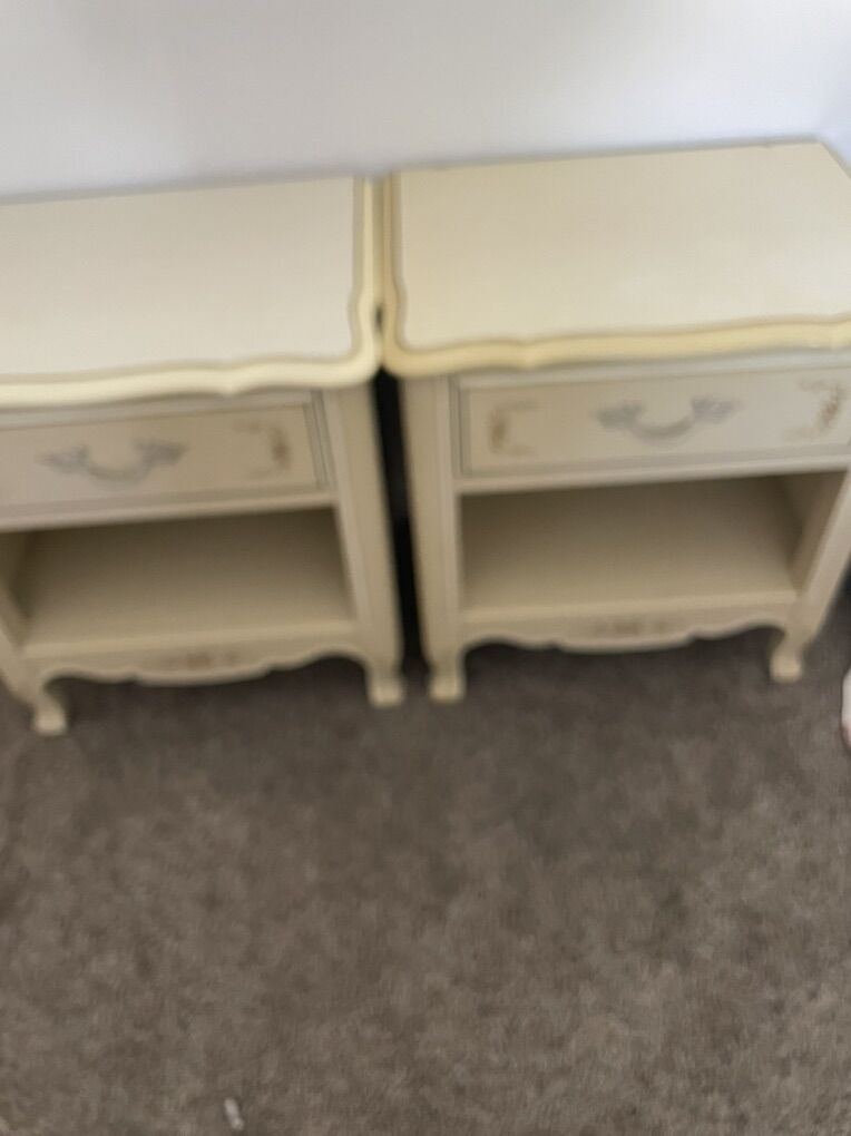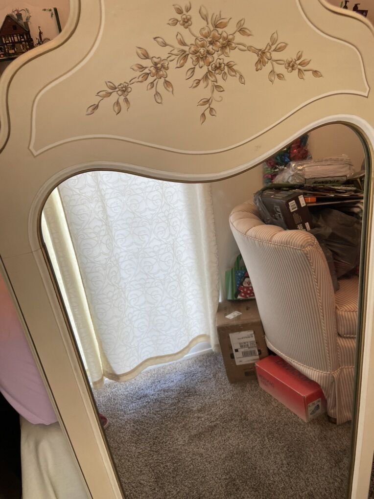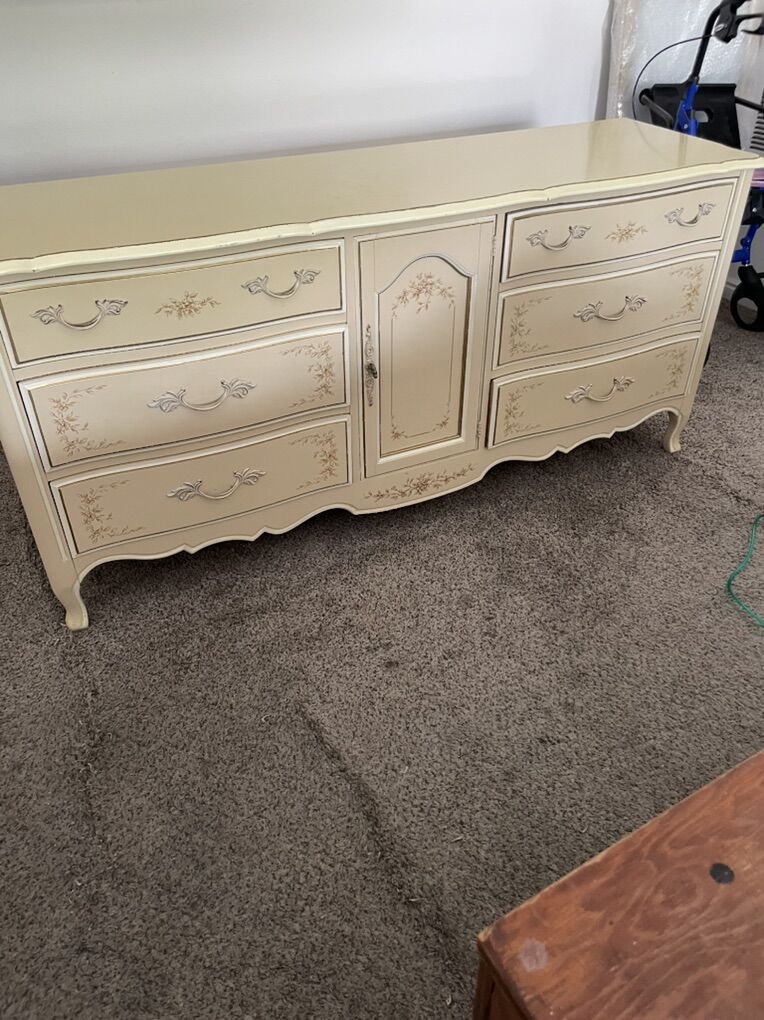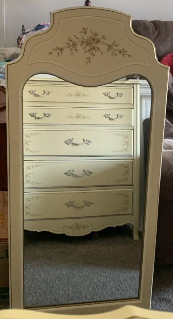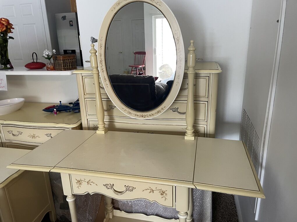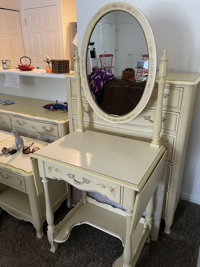 VenmoVintage Drexel Furniture La Fleur Collection Long dresser with mirror , tall dresser, 2 night stands, Vanity with round mirror and fold down sides.