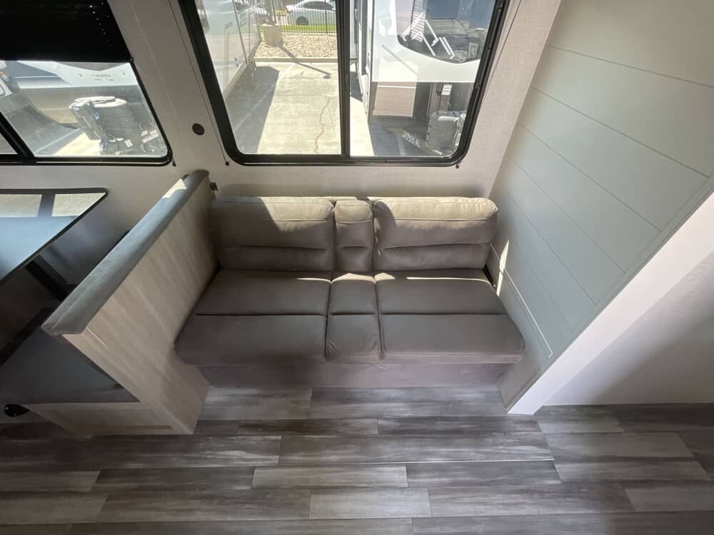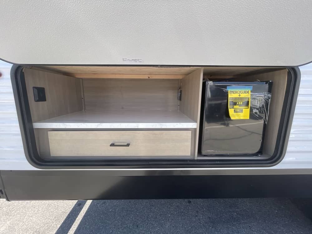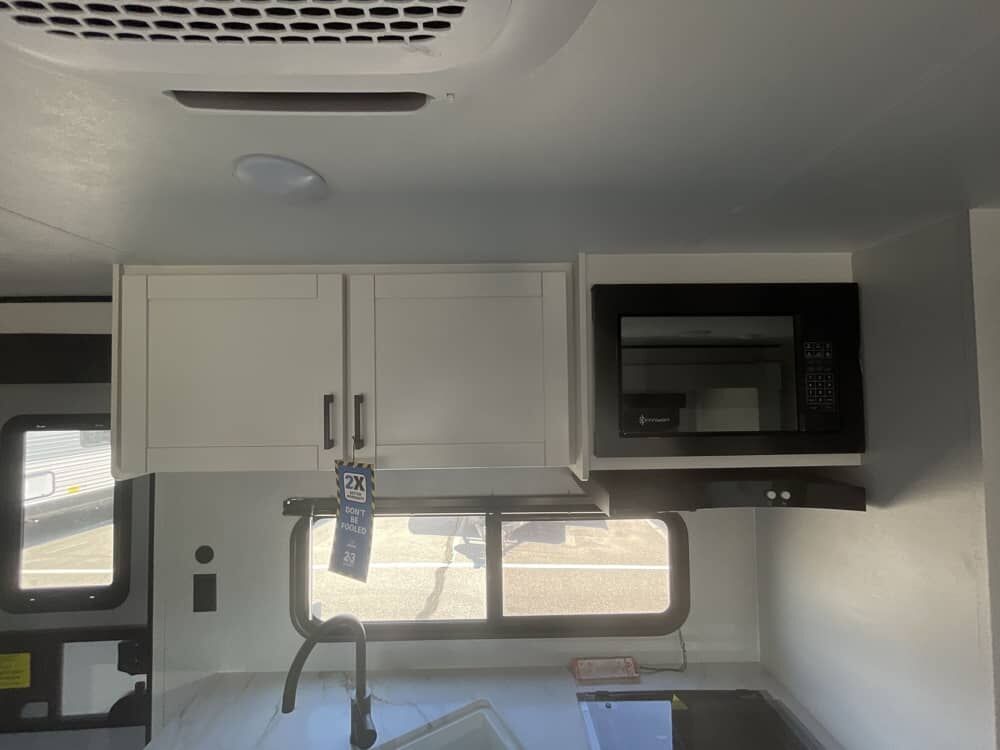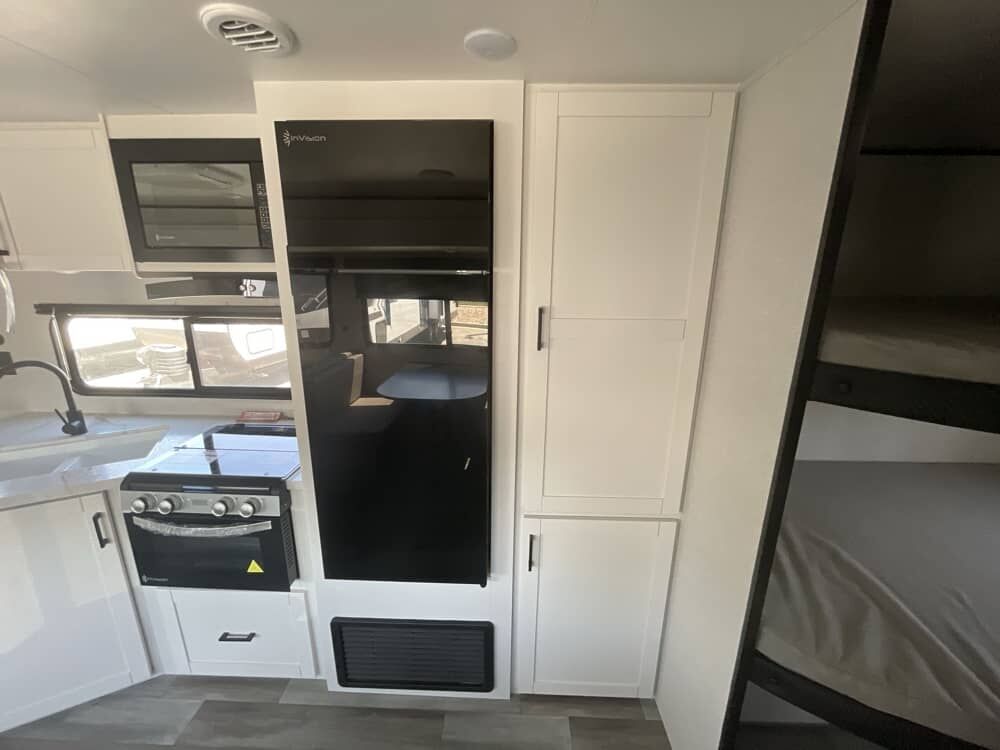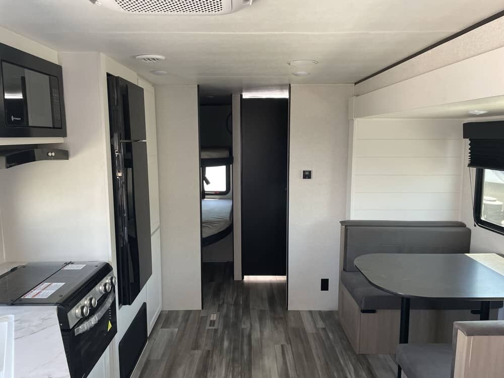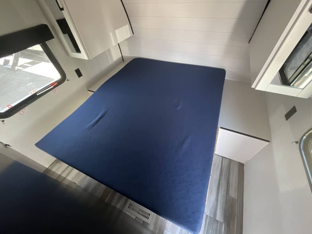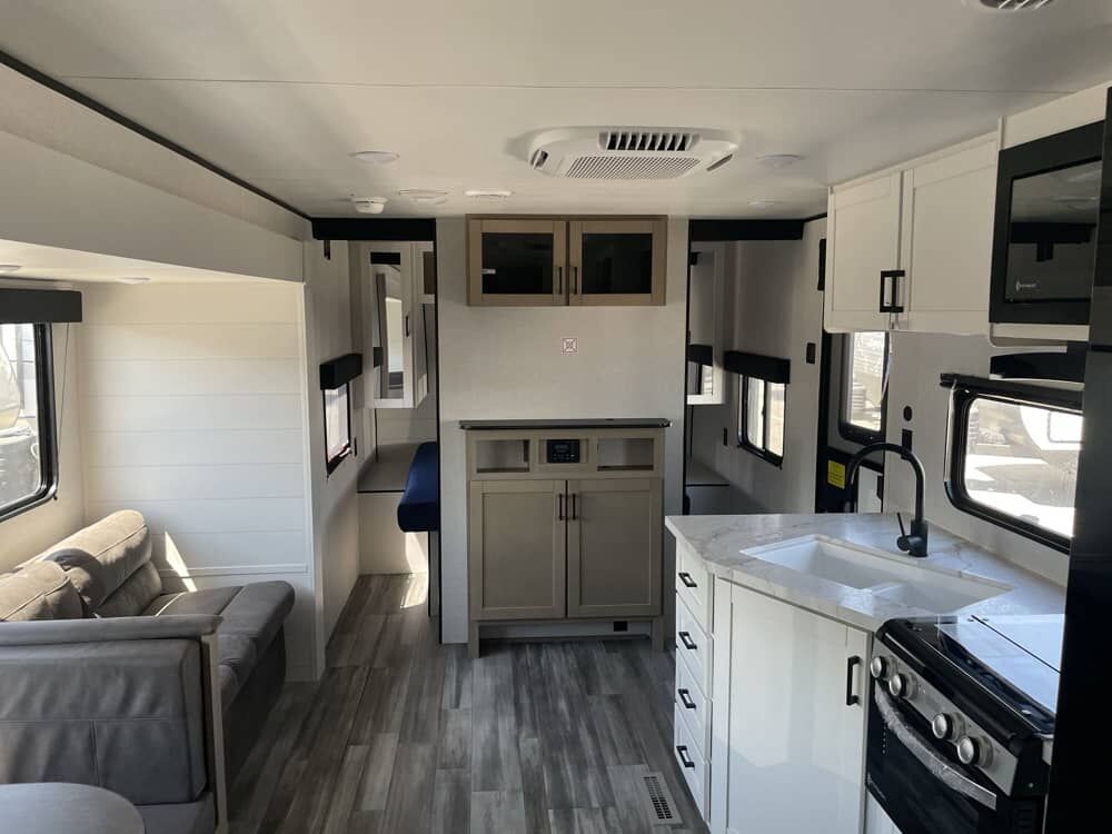 Inside, you’ll find solid hardwood cabinet doors with hidden hinges, giving the space a modern, residential feel. Oversized cabinets and under-bed storage ensure there’s room for everything you need, while the lit exterior passthrough storage makes packing and unpacking a breeze.