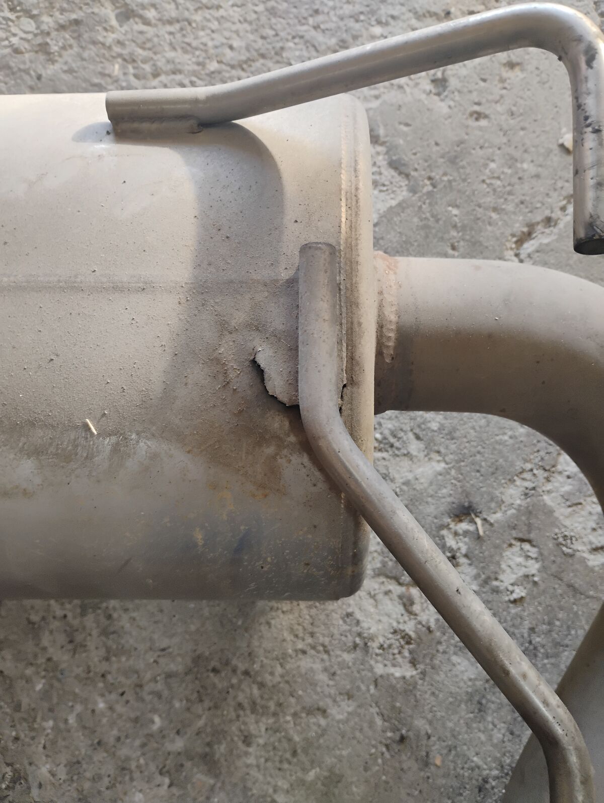 The muffler has a crack near one of the hangars. A simple weld job could patch pretty easily.