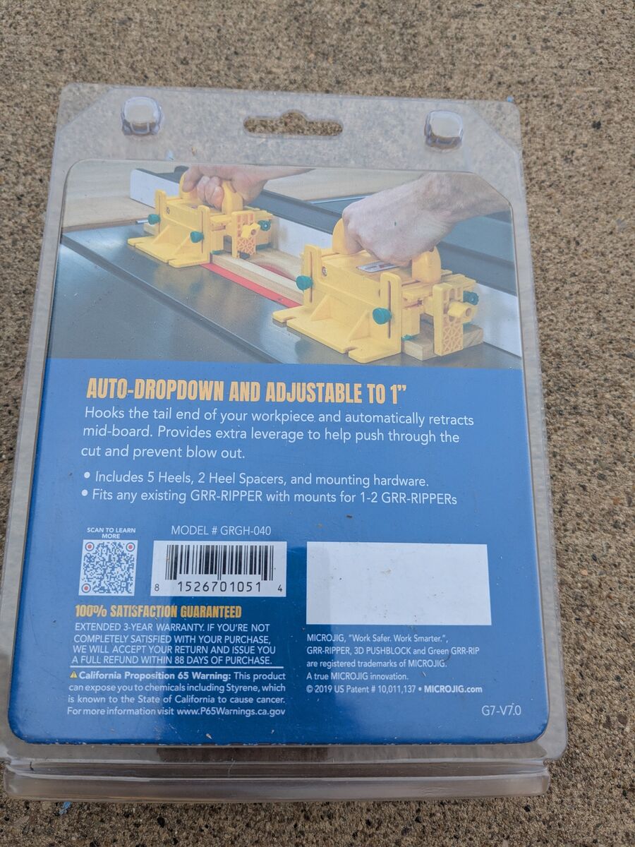 VenmoNew, factory sealed GRRR-RIPPER Gravity Heel Kit. Designed to improve control and safety when using GRRR-RIPPER push blocks on table saws, router tables, jointers, and band saws. Includes all original components. Never opened, stored in my garage. Great upgrade for any woodworking setup.