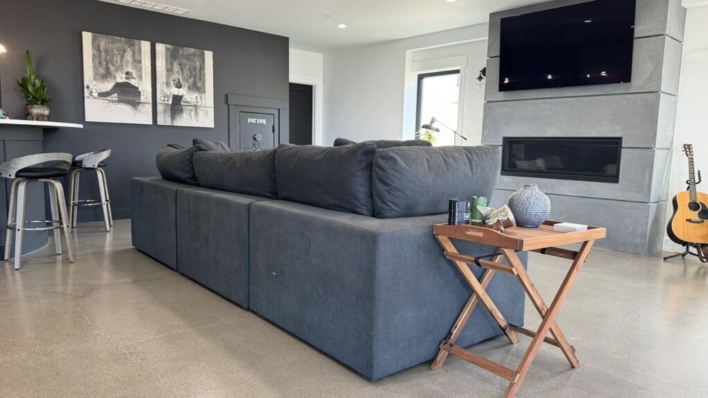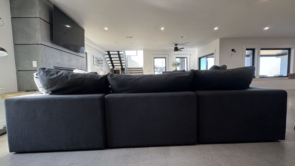 Modern, oversized sectional couch in excellent condition. Deep charcoal/dark gray fabric with a low-profile, contemporary design. Very comfortable with deep seats—great for lounging, movie nights, or hosting guests. Modular sectional layout fits large living spaces well. Clean, smoke-free home, no stains or odors. Includes accent pillows shown. Makes a statement piece while still being neutral and easy to match with most décor. 11’ x 11’ end to end 26 inches tall without pillows Each section is 44 by 44 inches