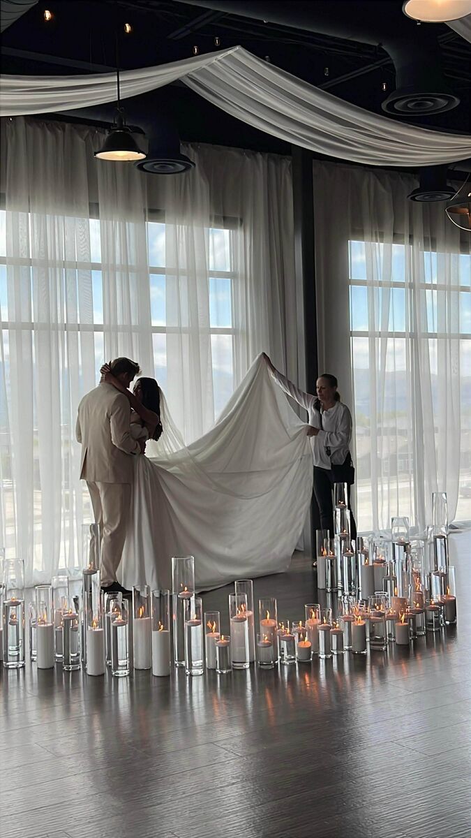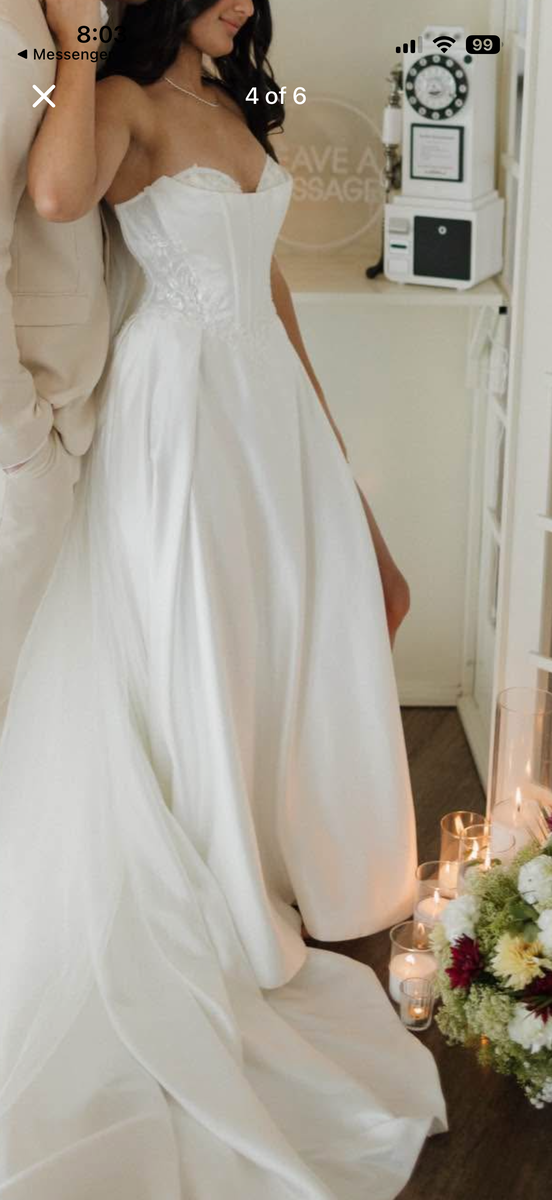 ApplePayBought this beautiful wedding dress and ended up changing my mind. Has lace detailing on the top, slit with snap to close it, long train, detachable sleeves, and wrist loop to hold the train. Comes fresh from the dry cleaners with bag! Originally a 6, brought in to about a 2, can easily be let out.