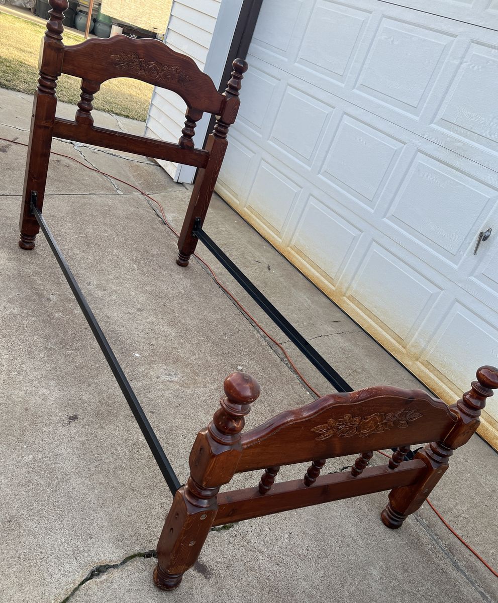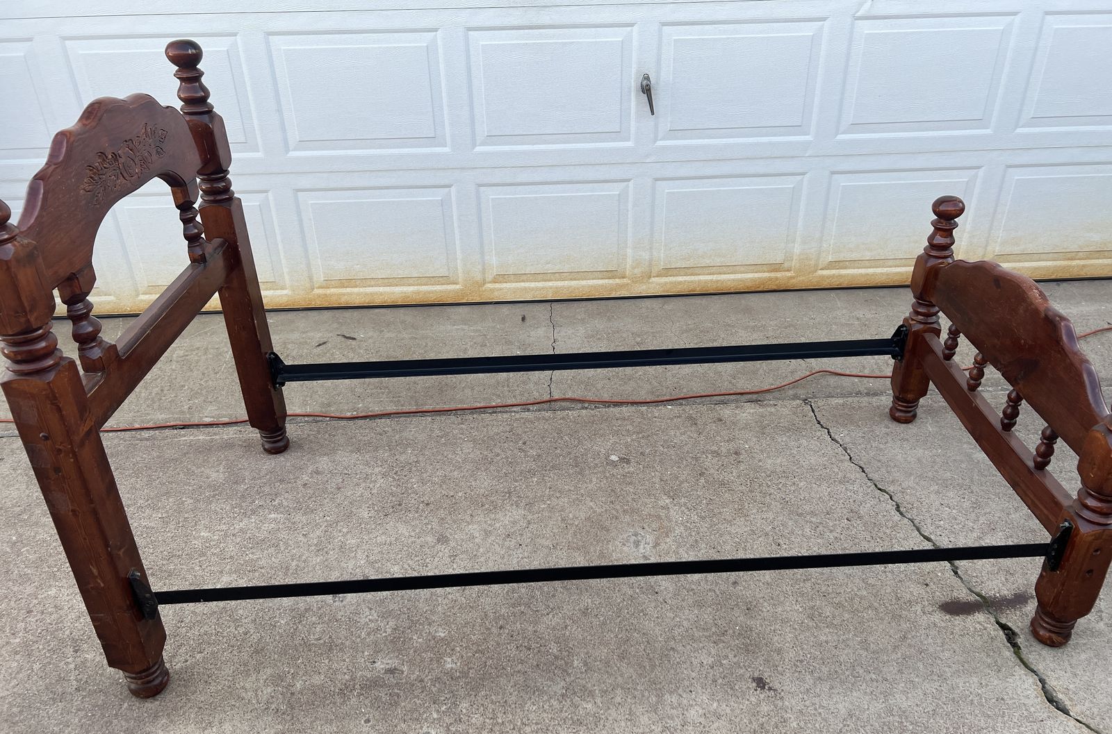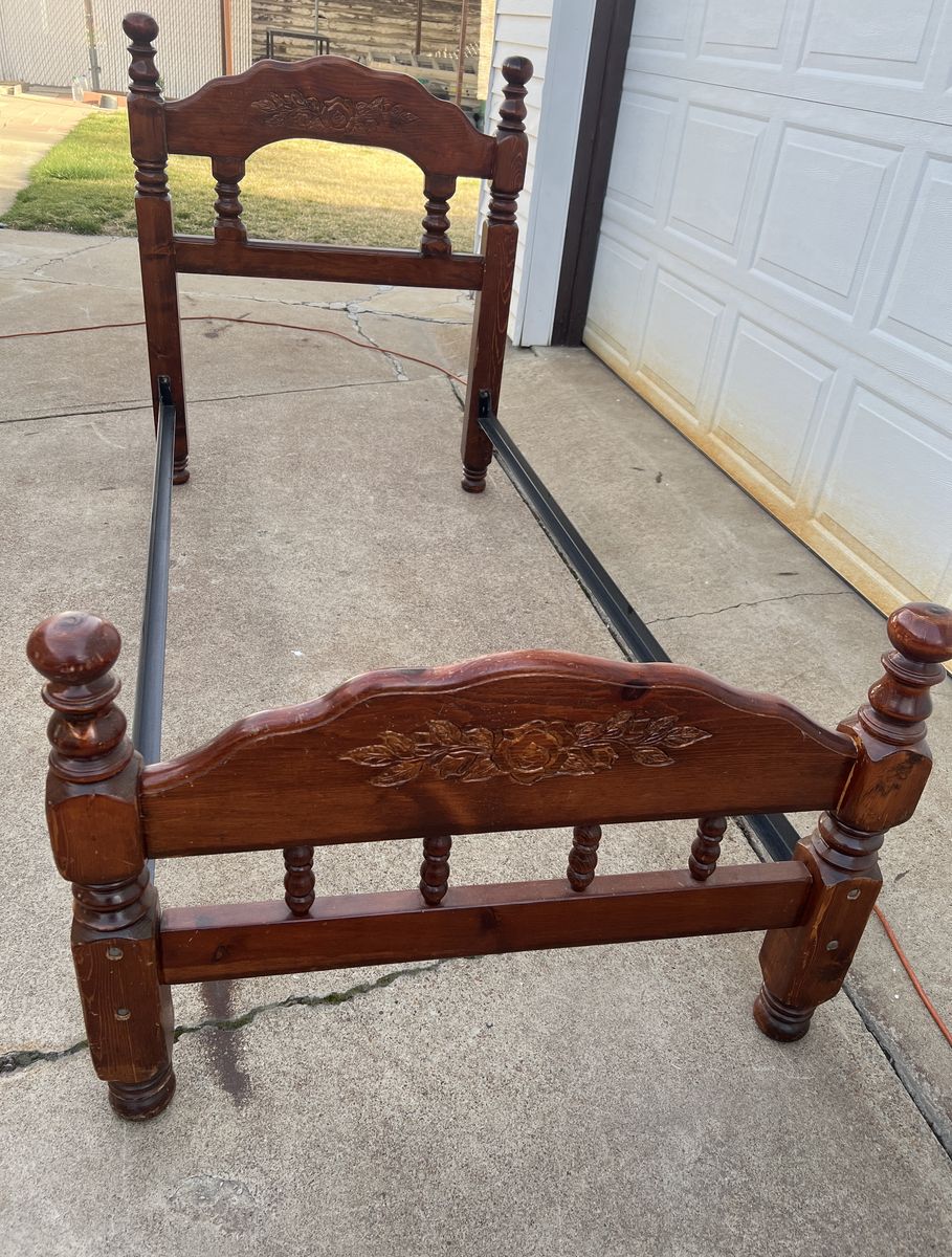 Twin bed frame that is made of real wood and is in good condition, solid strong structure - comes with the metal rails. Headbaoard: 4' tall X 40" wide. Footboard: 29 1/2" tall X 40" wide. $80 - cash.