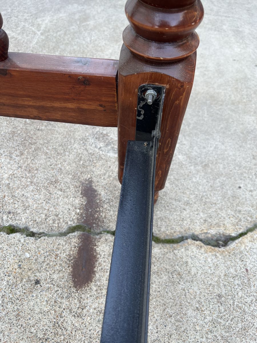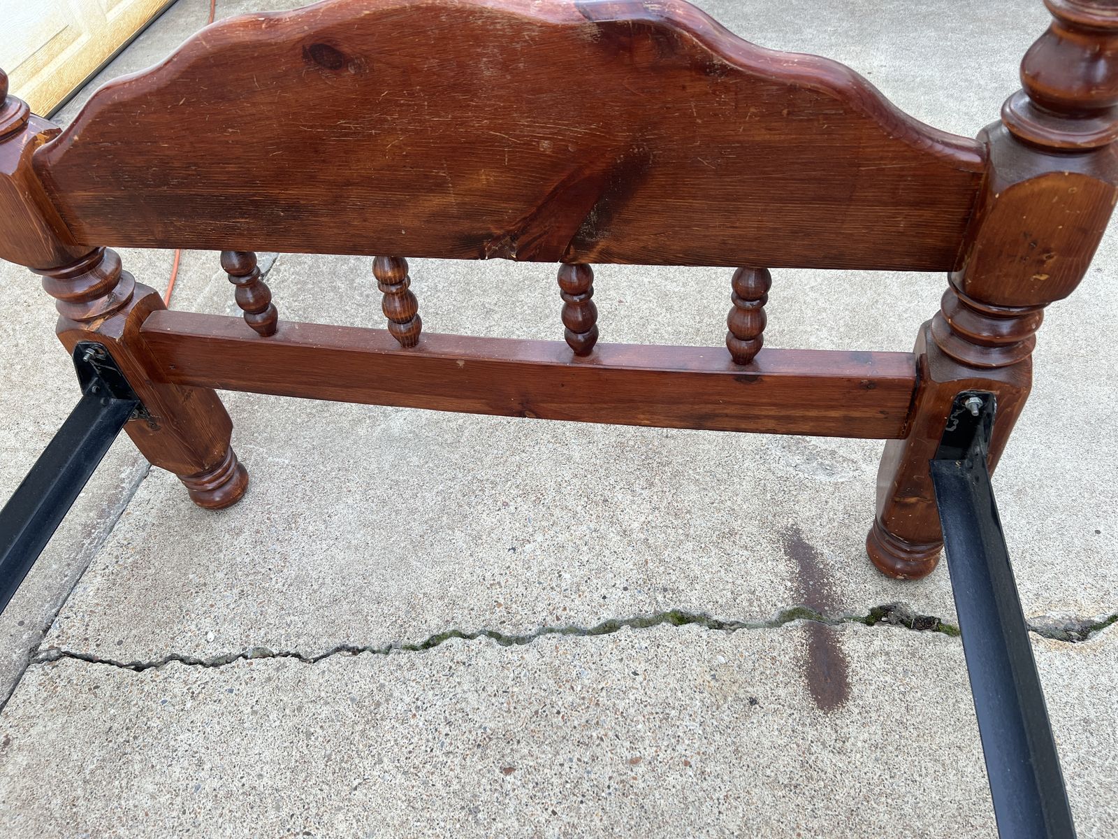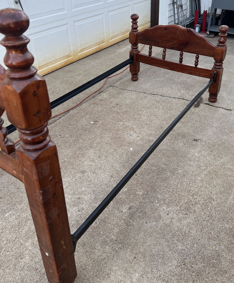 Twin bed frame that is made of real wood and is in good condition, solid strong structure - comes with the metal rails. Headbaoard: 4' tall X 40" wide. Footboard: 29 1/2" tall X 40" wide. $80 - cash.