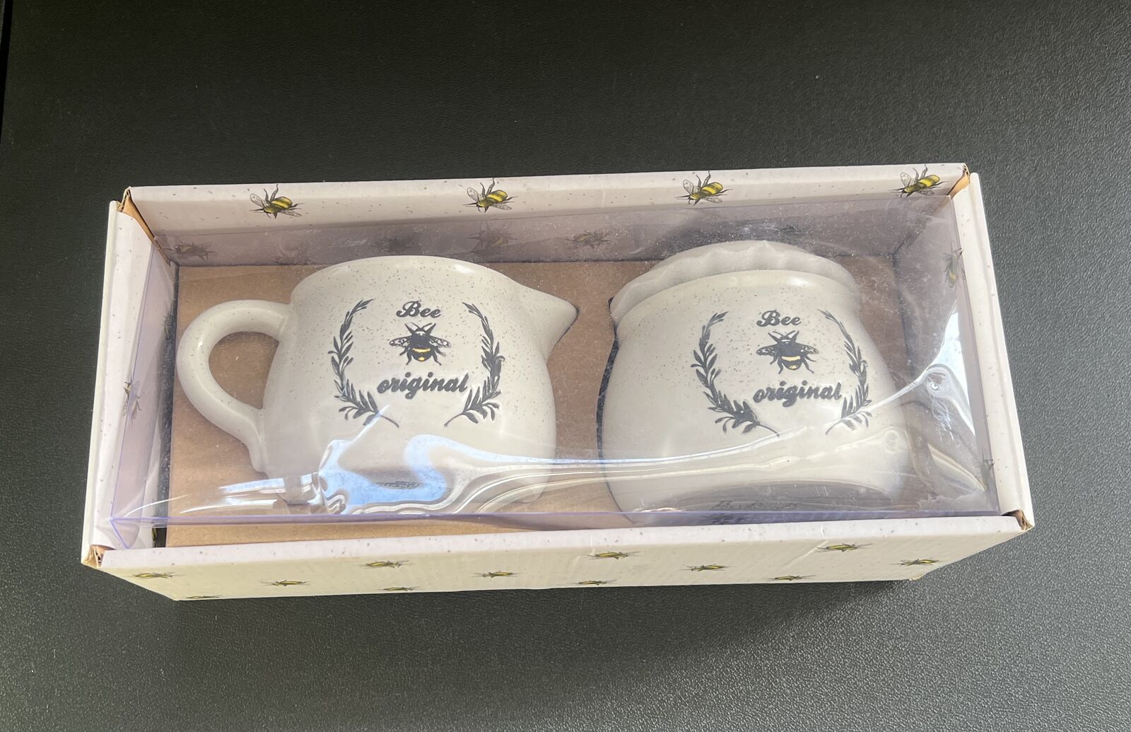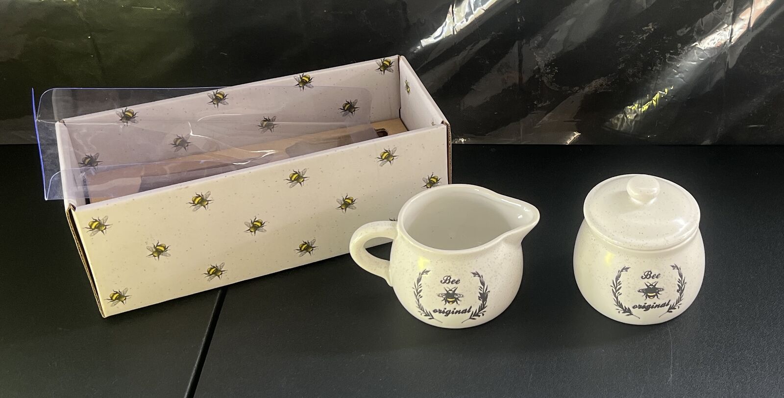 Creamer & Sugar set with a Bee design. Sugar container is about 4" wide & about 3 1/2" tall. Creamer container is about 4" wide & about 3" tall. New. $10 - cash.