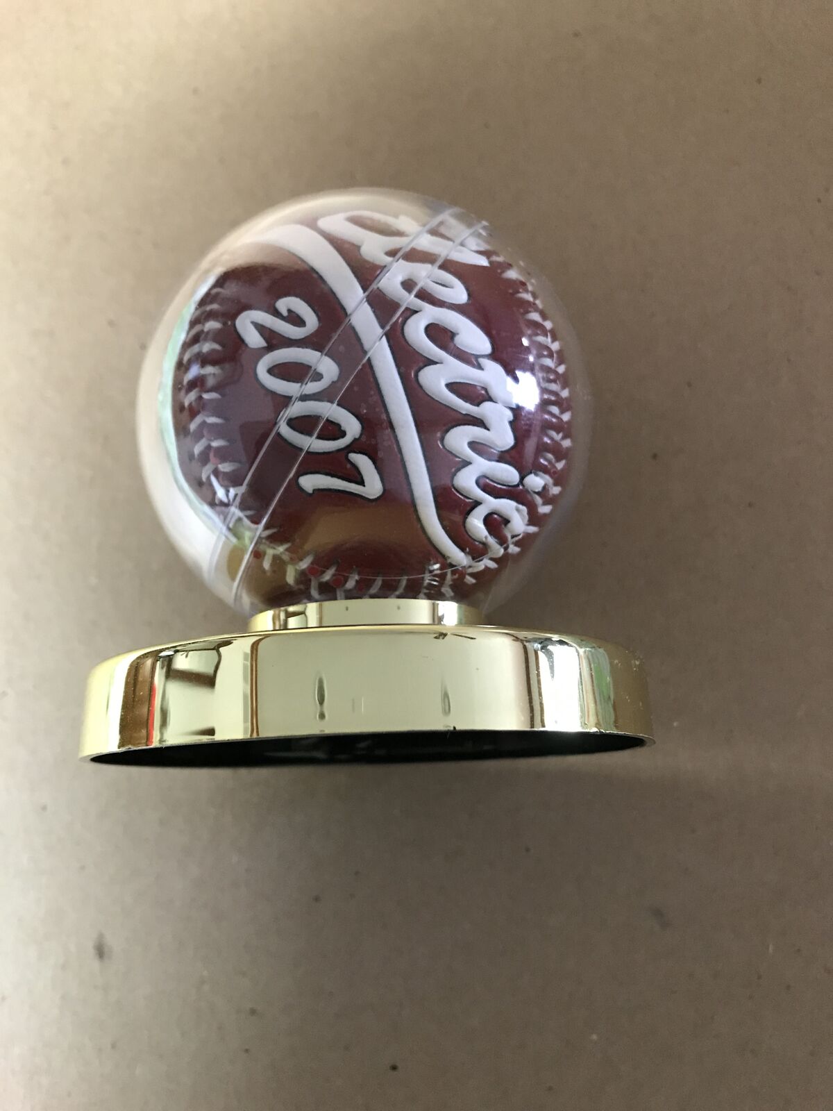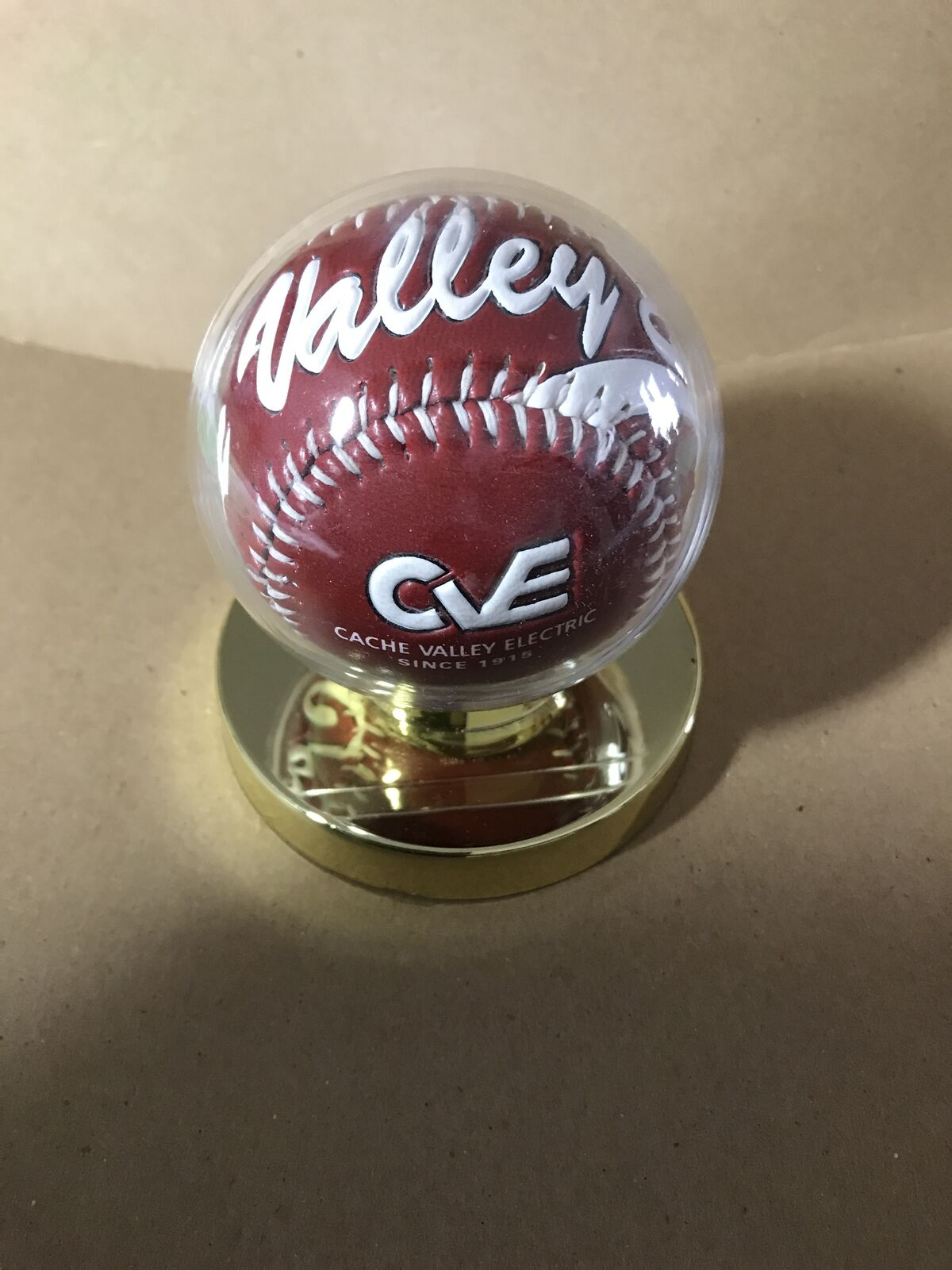 CVE CACHE VALLEY ELECTRIC Utah 2007 Red White Souvenir Baseball Ball. With Gold Base Ball Holder. Even though it is 007 it is new in box.