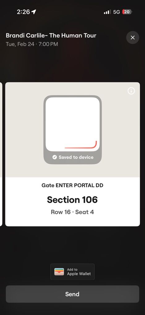 VenmoI have a pair of tickets for Brandi Carlile, Tuesday, February 24th, 7 PM at The Delta Center. Section 106, Row 16, Seats 3&4. $50 per ticket $100 for a pair. Selling as pair only. Cheaper than Seatgeek after all their fees so your saving cash. Priced out and tickets in this section go for about $147. Electronic tickets so easily transferable through Seatgeek. Venmo preferred for fast & easy transfer. Text Will at 801-664-3768. And please message me directly and not through the KSL app for faster response.