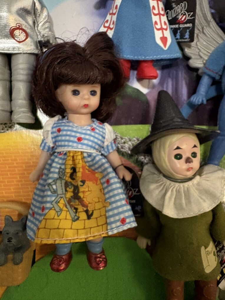 ZelleMadame Alexander 5” miniature replicas of Wizard of Oz characters 1doll per each category Dorothy and Toto in basket 1scarecrow, lion, tin man 1wicked witch, guard and monkey 1lolipop, lullaby guild, 1flower munchkin 1Glinda 1Wizard of Oz 13 beautifully dressed dolls