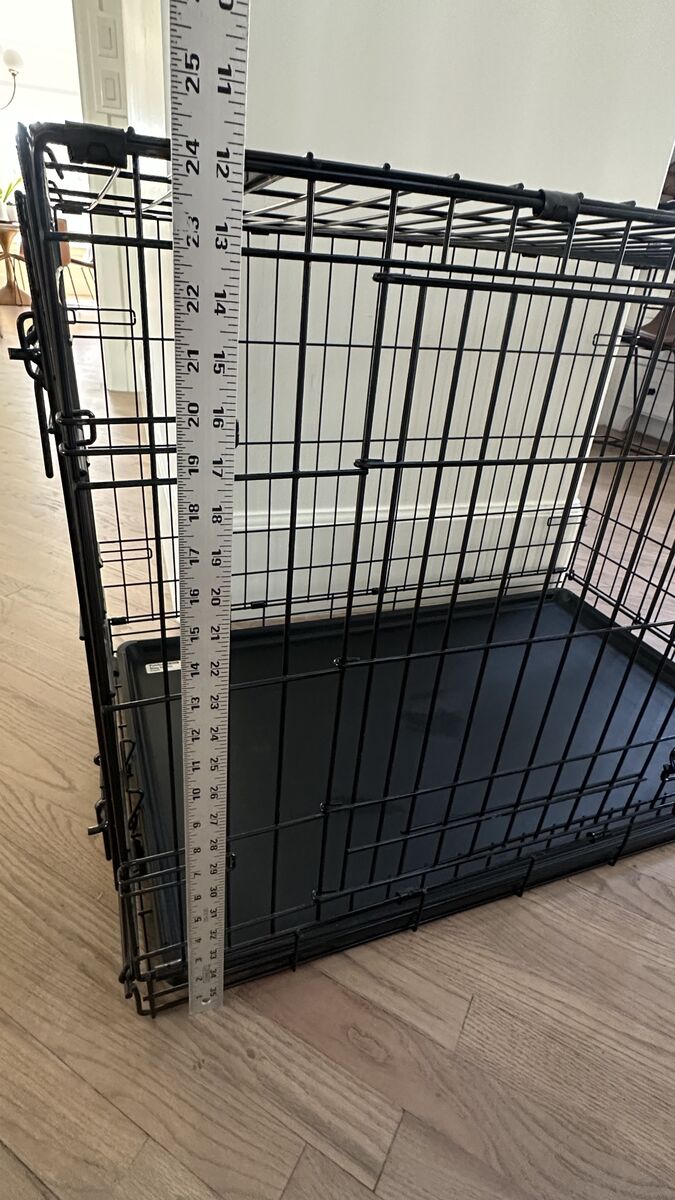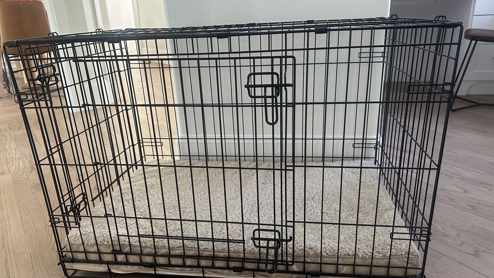 ZelleLarge metal dog kennel. Big enough for my 65 lb. golden retriever. The right size to fit under a desk or table. Two doors- on the short end and the long end. Thick kennel pad included.