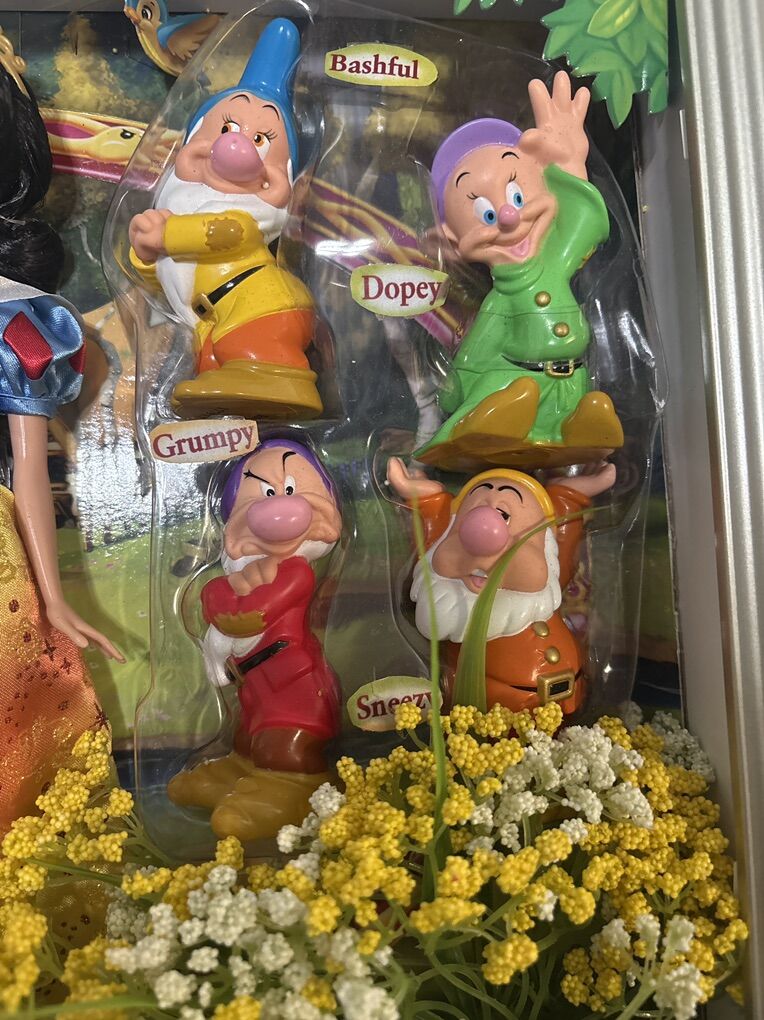VenmoIn Frame play-O-Rama of storybook 12 “ Barbie Snow White. 4” Hard plastic Dwarfs. Dolls have never been removed or played with. What a fun addition to a little girls room who loves Disney Princesses and characters! Characters are removable from frame.