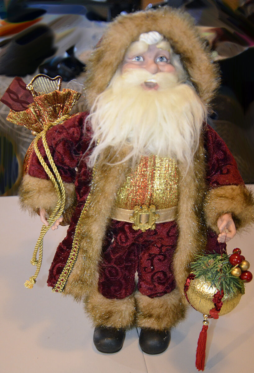 PayPalSanta Claus figurine. Dressed in a plush burgundy velvet coat with ornate gold embroidery and soft faux fur trim