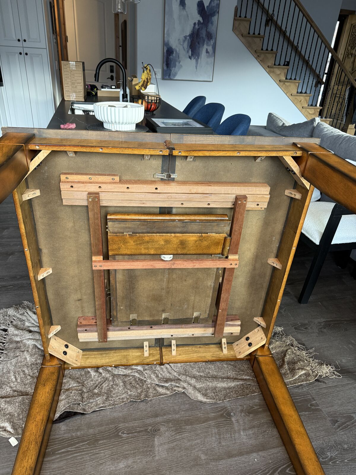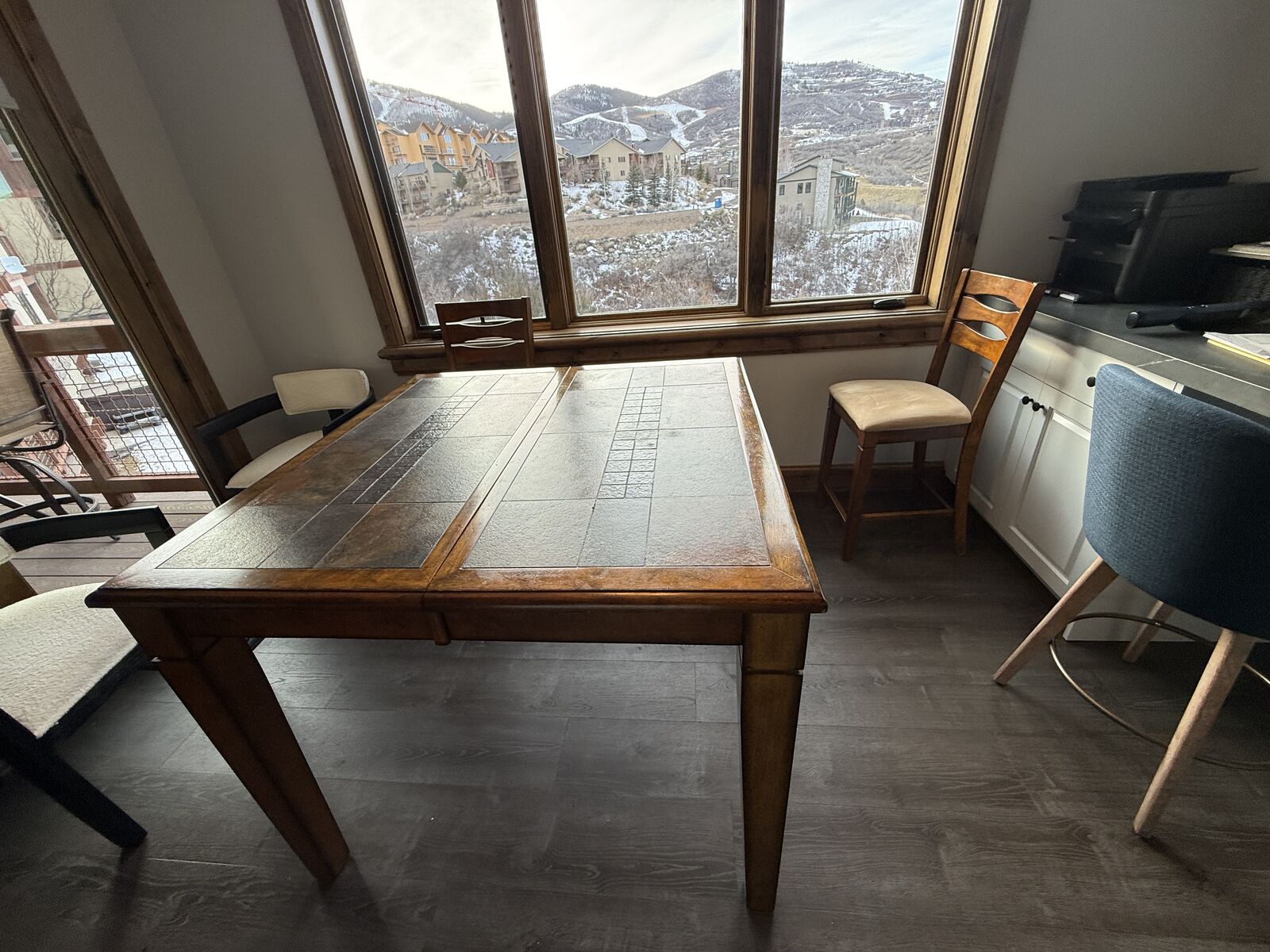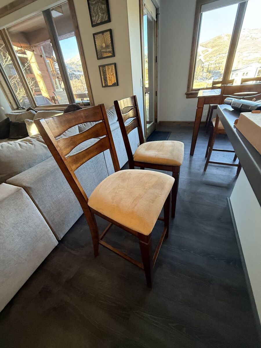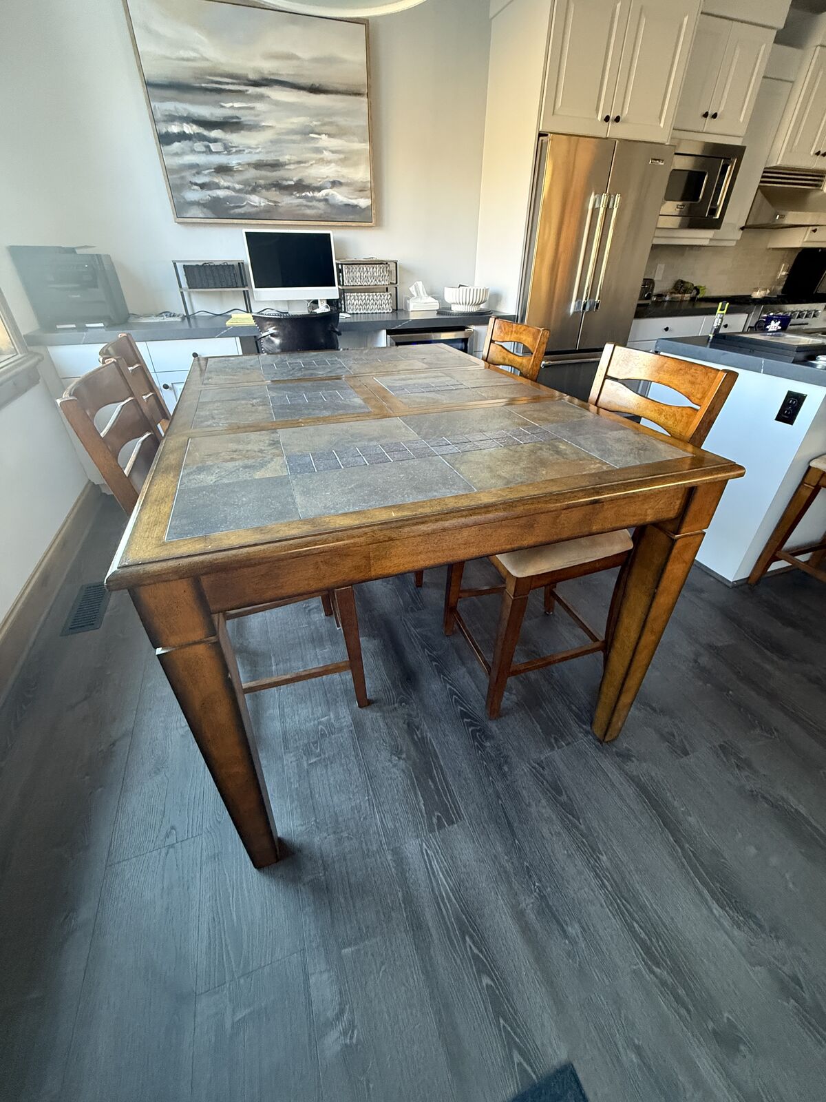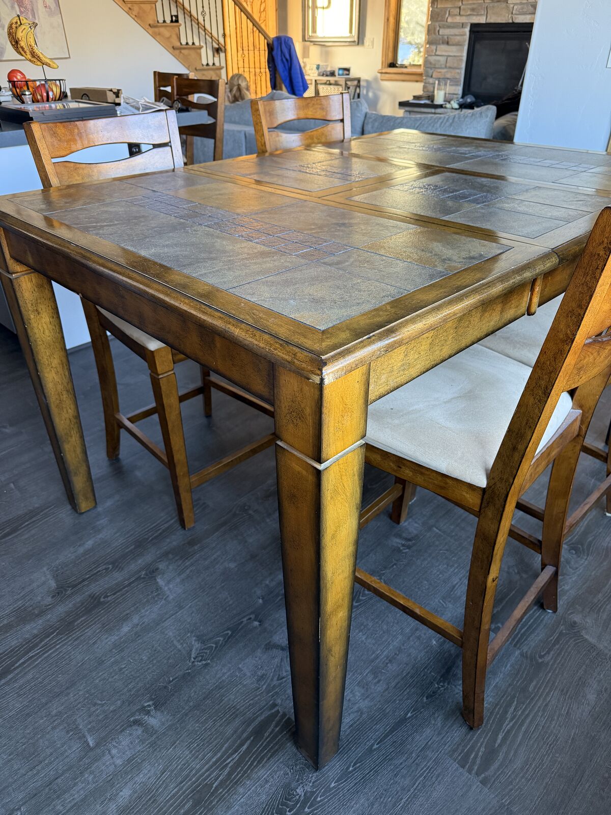 VenmoTable converts from square (seats 4) to rectangle (seats 6). Leaf simply drops down and conveniently stores below table. Table and 6 charis are counter height.