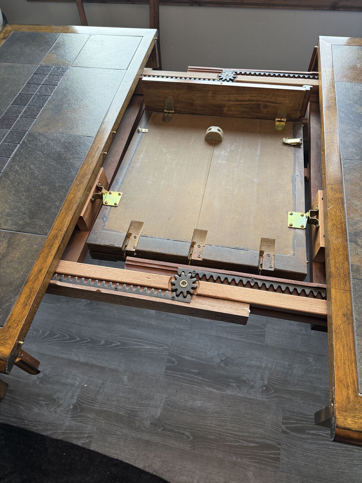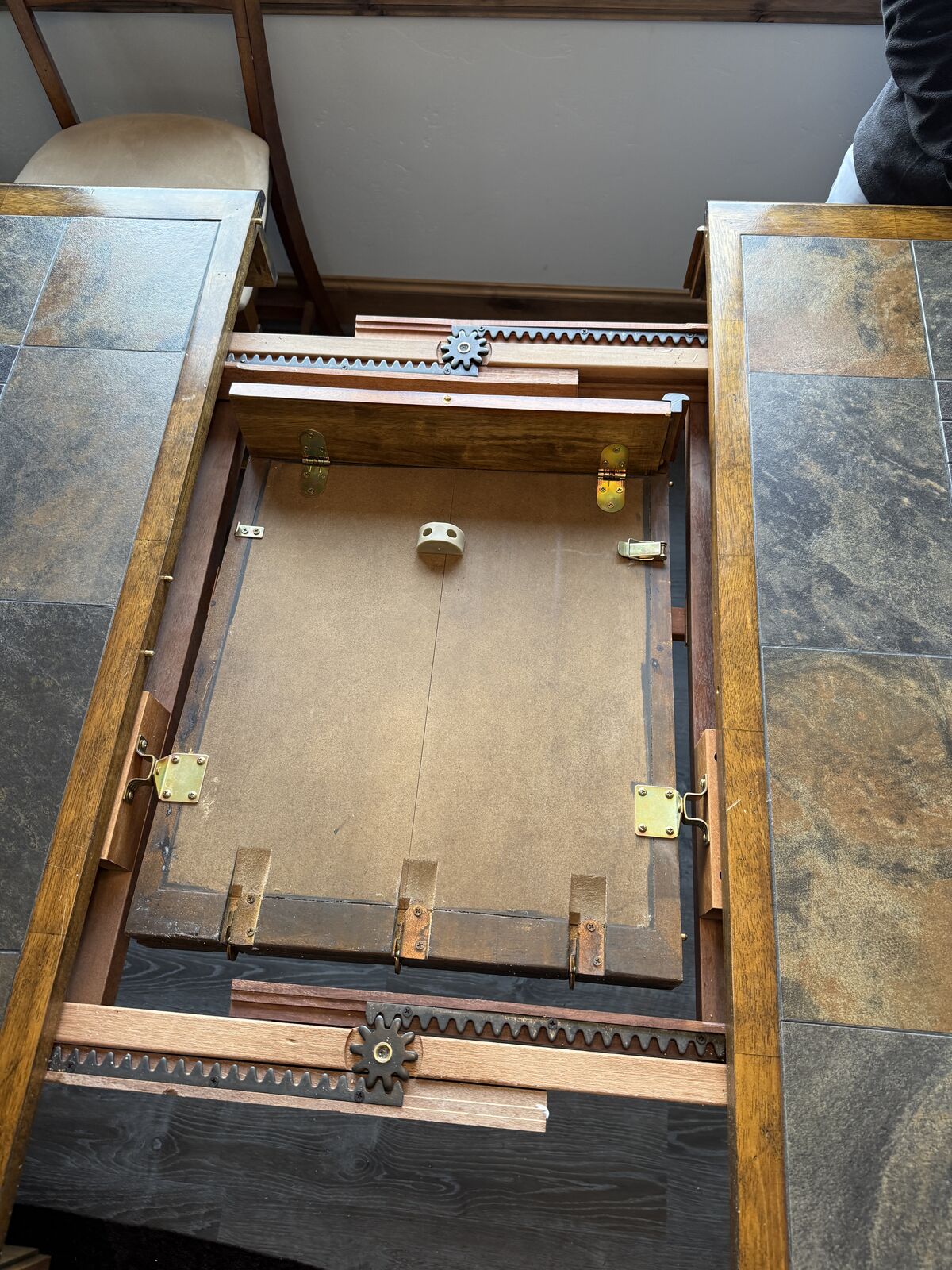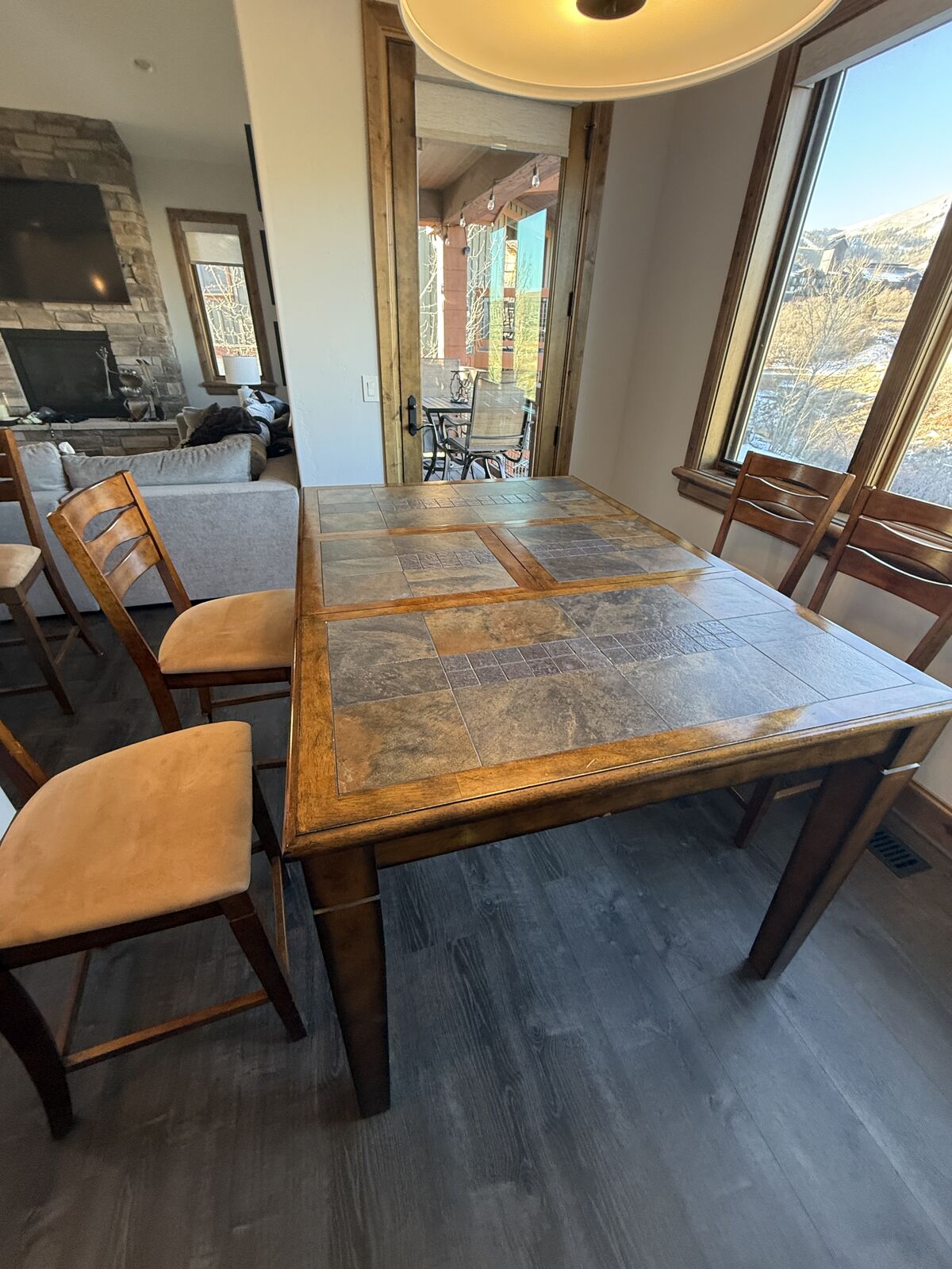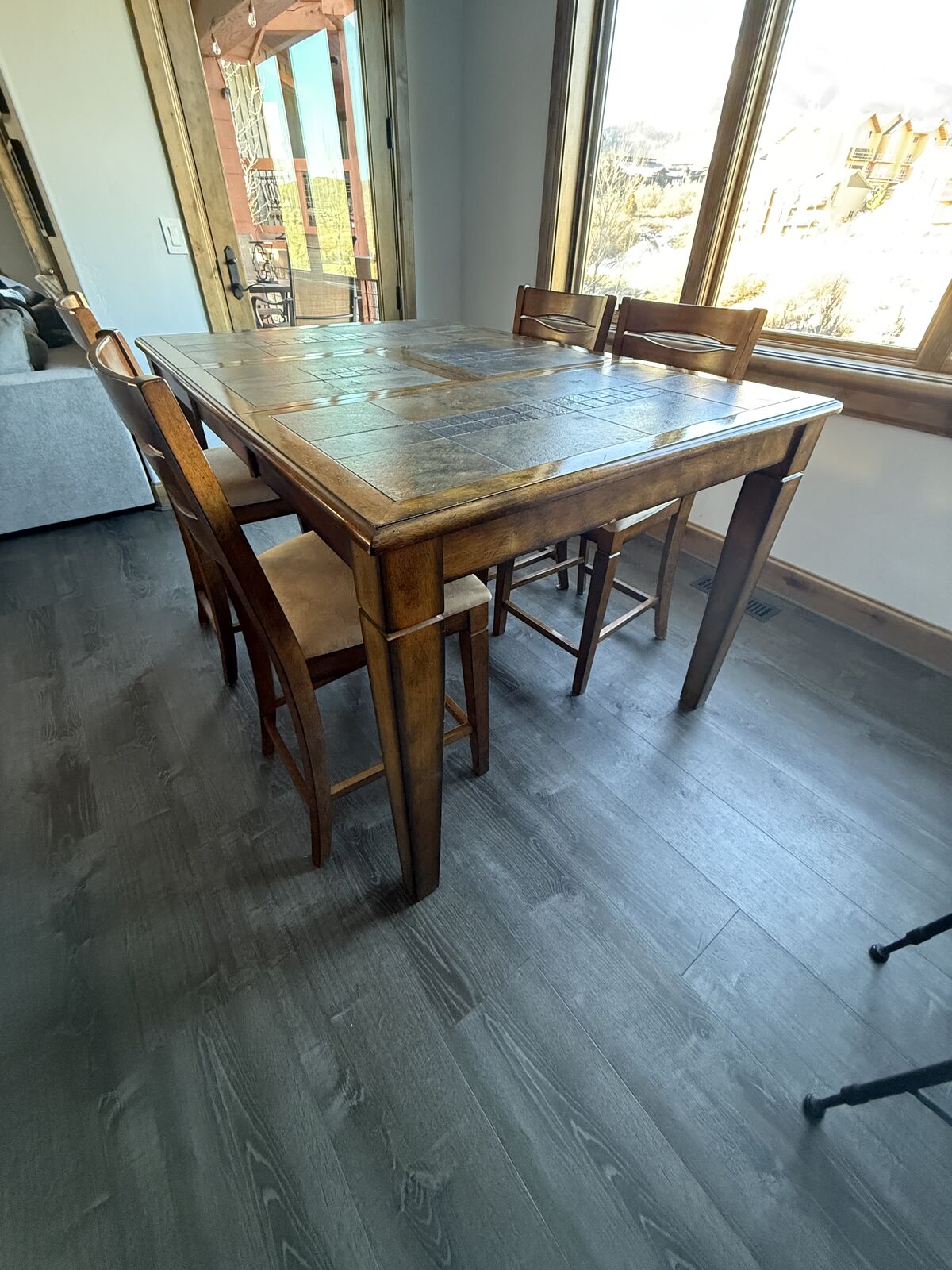 VenmoTable converts from square (seats 4) to rectangle (seats 6). Leaf simply drops down and conveniently stores below table. Table and 6 charis are counter height.