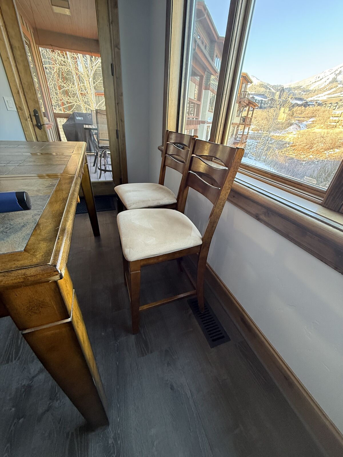 61.25”x43.75”x36”high with leaf. Leaf measures 18” and conveniently drops down below table when not needed. Chair height (seat) 24” and back of chair 41”