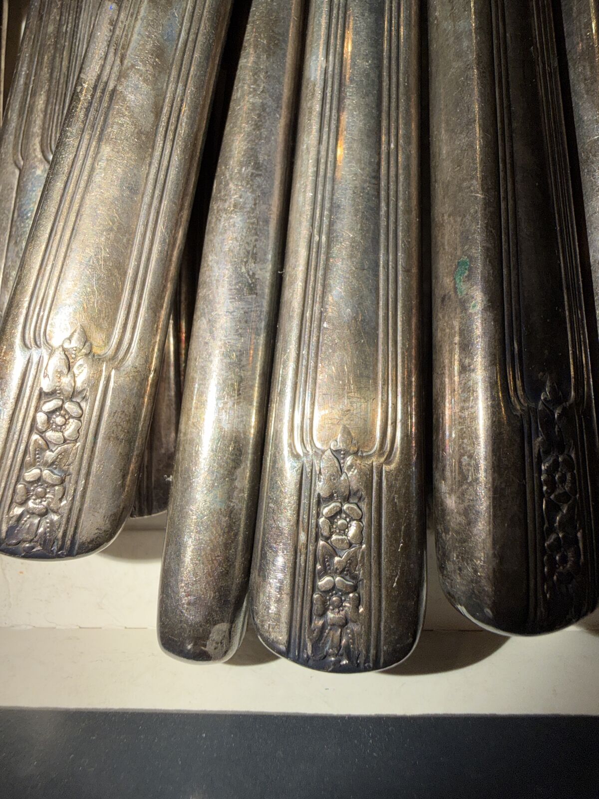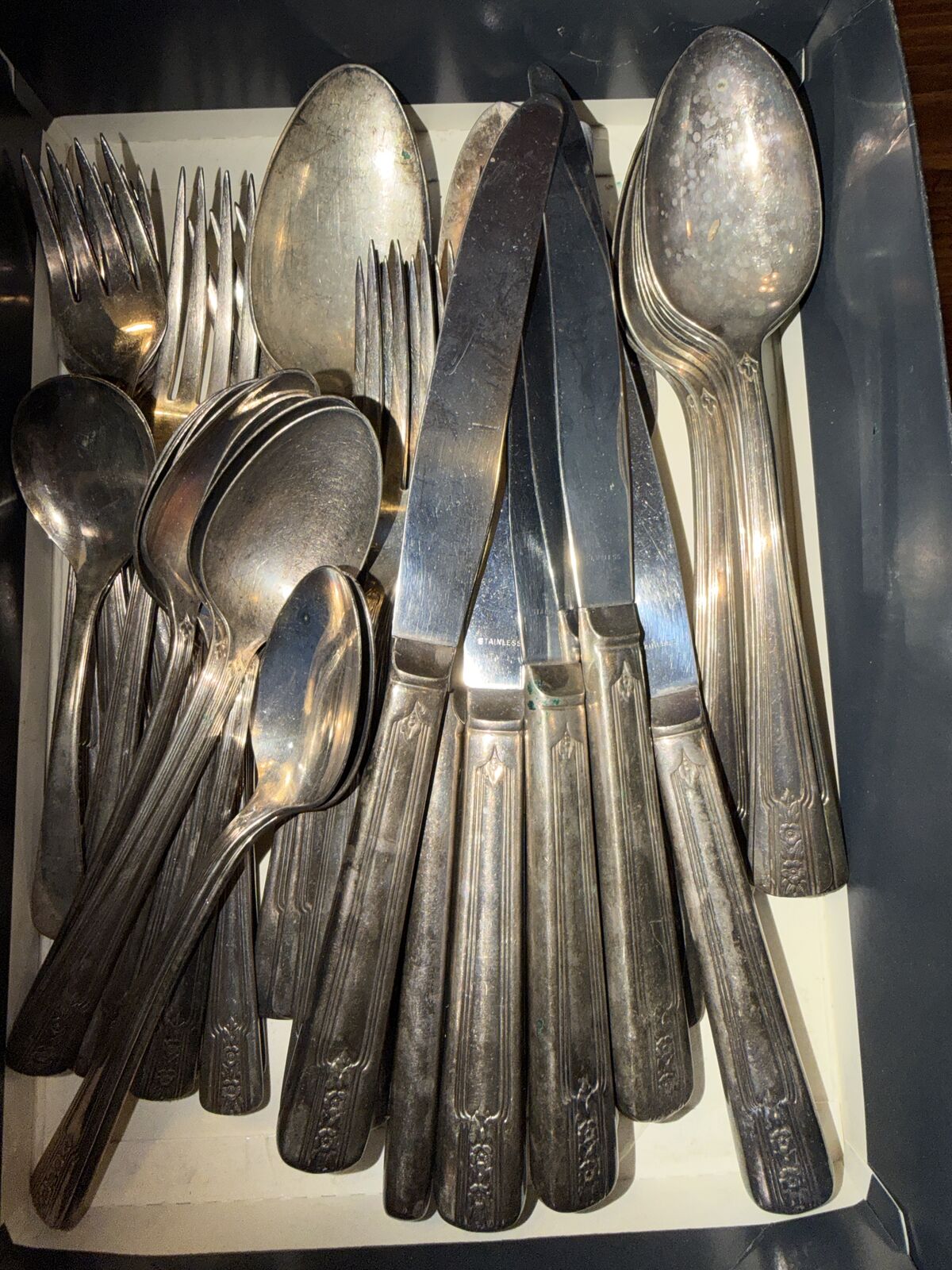 VenmoThis is an incomplete set of Wm Rogers IS (International Silver) flatware in the Louisiane pattern. The Louisiane pattern came out in 1938 as part of the Sectional line from Wm Rogers. The styling is Art Deco with a delicate floral pattern on the handle. This listing consists of the following pieces: · 8 knives – 8.5 in · 5 dinner forks – 7.5 in. · 16 teaspoons – 6.25 in · 6 desert/salad forks – 6 in. · 8 tablespoons – 7.5 in. · 2 serving spoons - 8.5 in · 1 cake server – 9.25 in. 46 pieces total Photos show current condition. Age-appropriate tarnish can be polished away. Comes from a smoke-free, pet-free household. Pickup location: Riverton All reasonable offers will be considered.