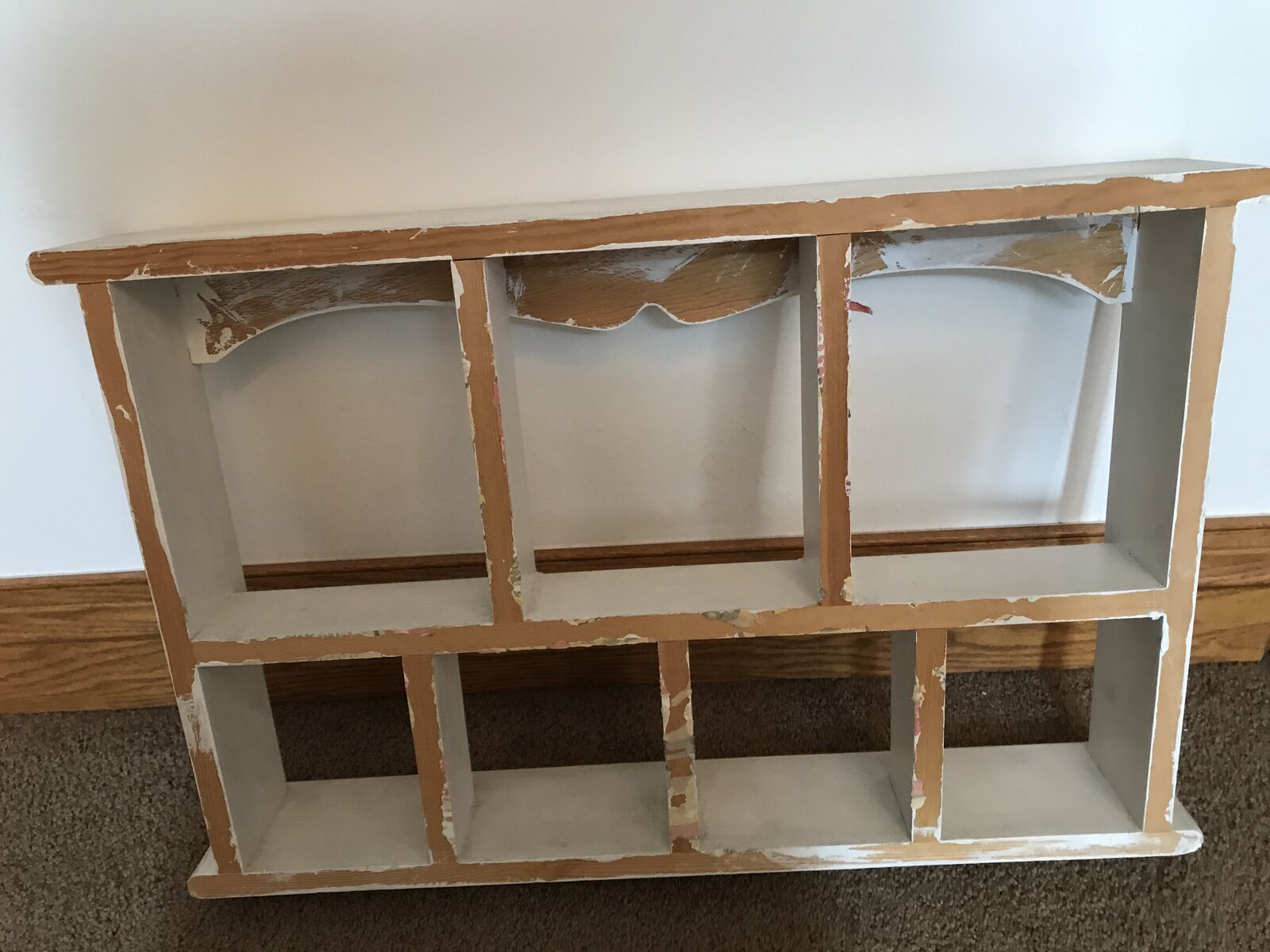 7 Compartments Shadow Box Wall Display Shelf 26” x 17” x 4” White. Does need to be repainted.