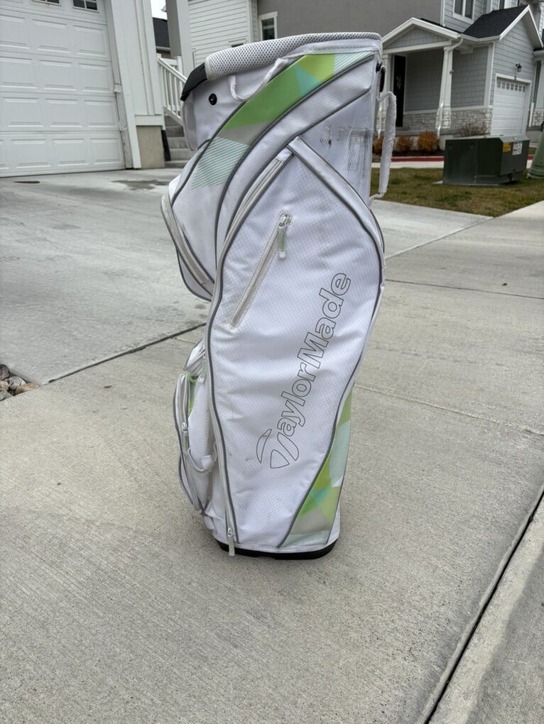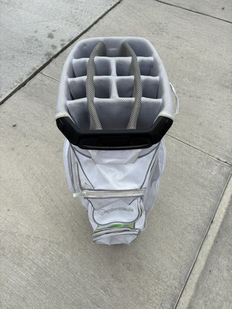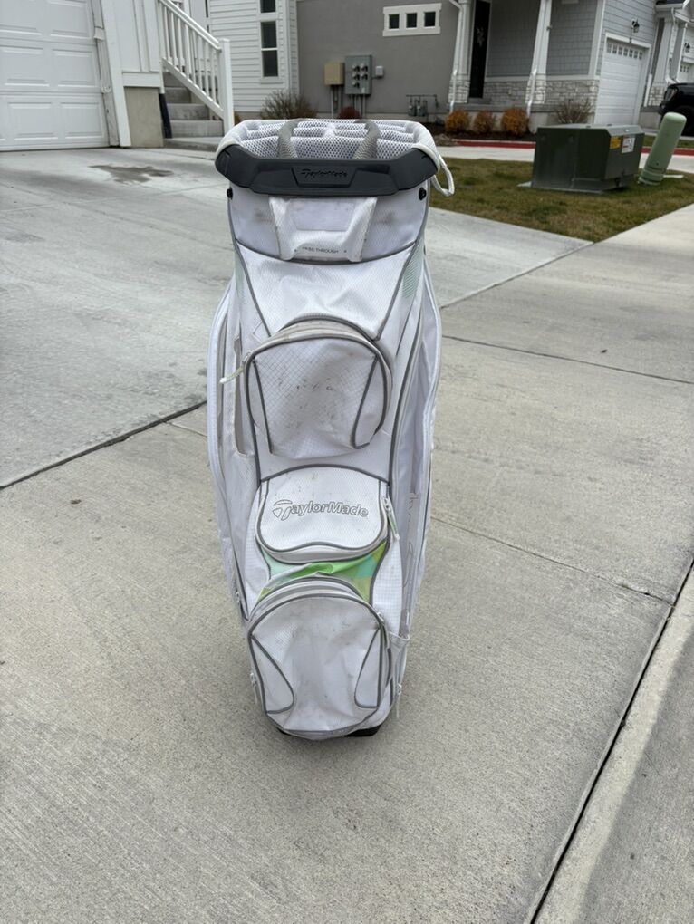 Description: TaylorMade cart golf bag in white with green/teal accents. Solid bag with lots of storage and a padded top.