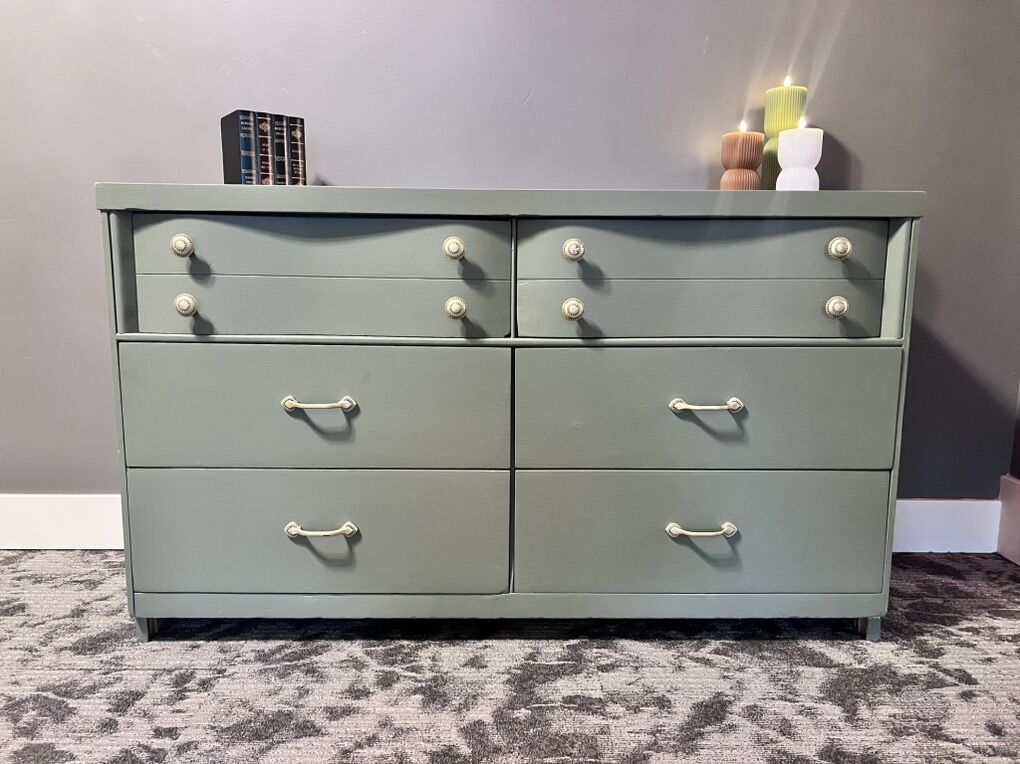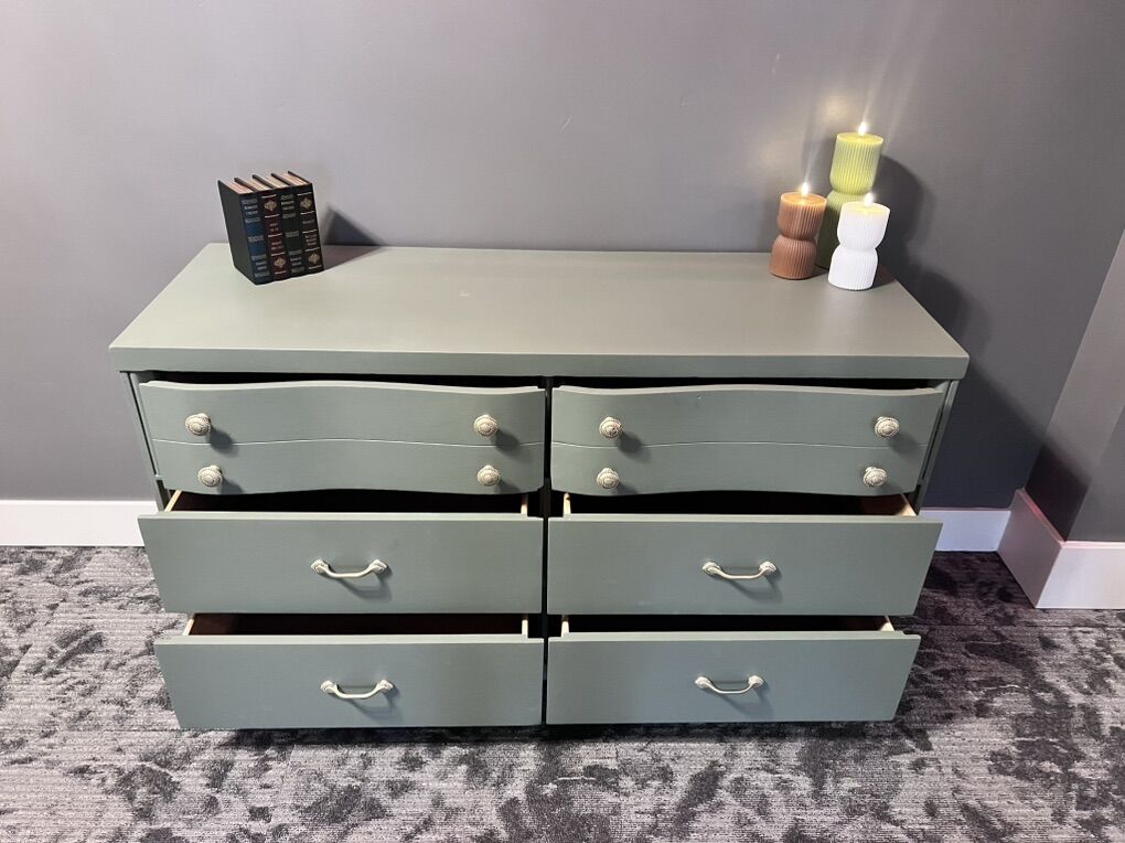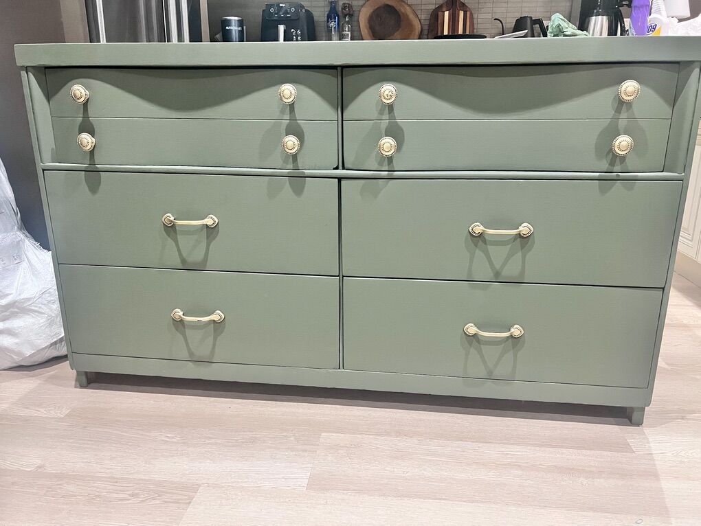 VenmoQuality solid wood dresser in a soft sage green finish. Smooth, fully functional drawers with stylish mixed hardware. Sturdy, timeless, and in great condition.