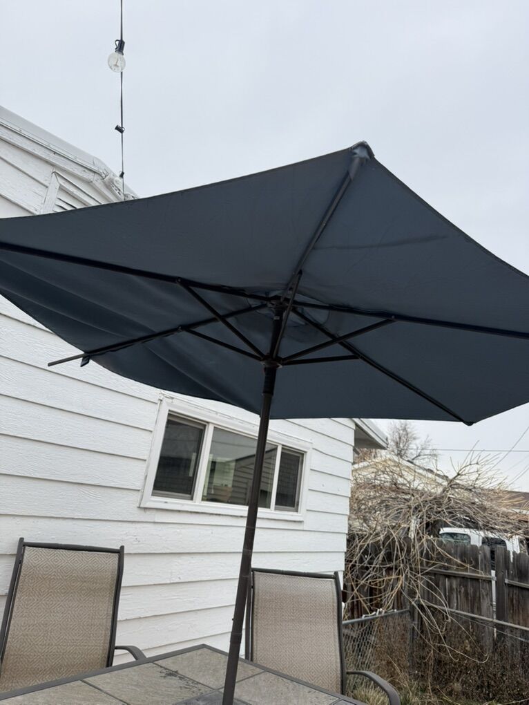 VenmoOutdoor dining set that includes a table with a built-in collapsable umbrella and 2 chairs. Table is metal with tile top. Chairs are metal with fabric seats. Table size: 40”x40”, height 36”.