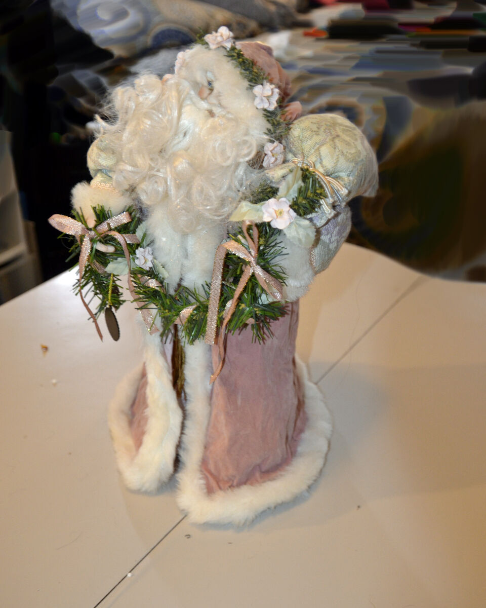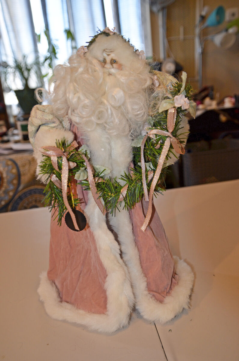PayPalSanta figurine stands approximately 18 inches tall. Dressed in a soft pink velvet robe with plush white trim.