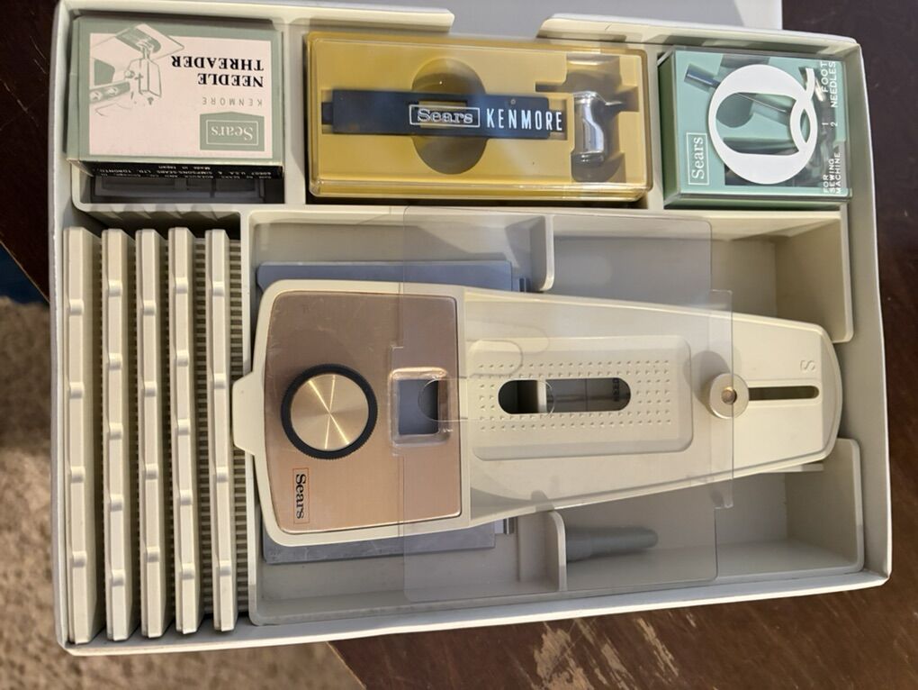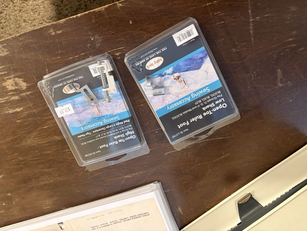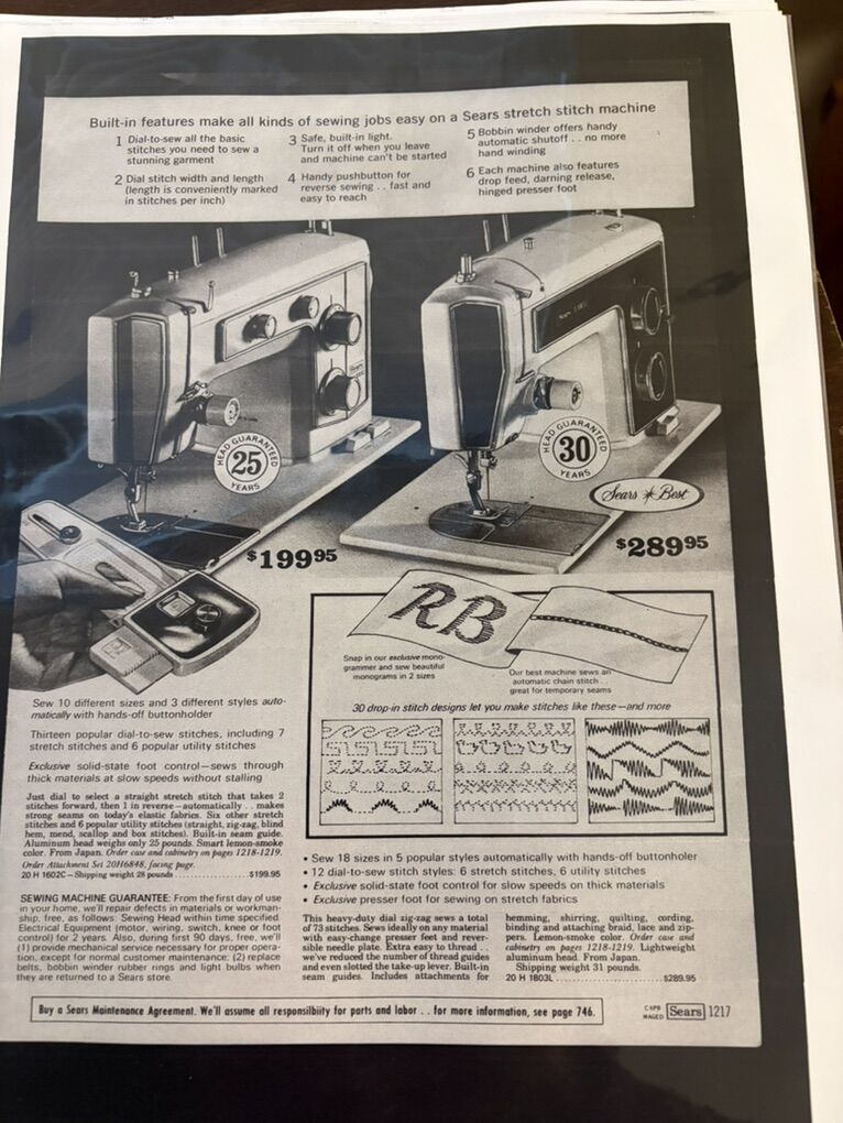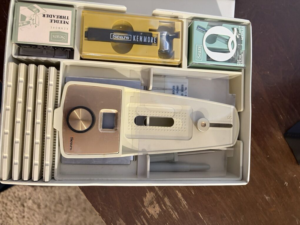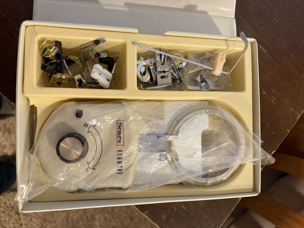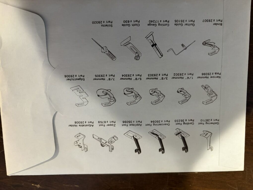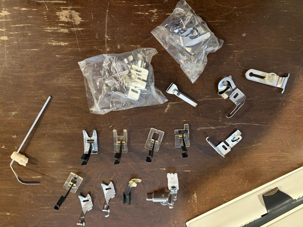 -All-metal gears with simple maintenance that can be done at home. -Monogramming -Buttonholes -Straight and Zig-Zag stiches -Cams for decorative stitches -Manual adjustments for stitch length and width and stitch type -Q-Foot for sewing stretch fabrics -Double needle capable -Full set of super high shank feet -Bobbin winder -Variable speed foot pedal (cords in great shape) -Adapter to allow for use of low shank or snap-on feet -Left-homing needle -Feed dogs can be dropped for free motion darning and quilting -Free-motion and ruler feet -Full Owner’s manual