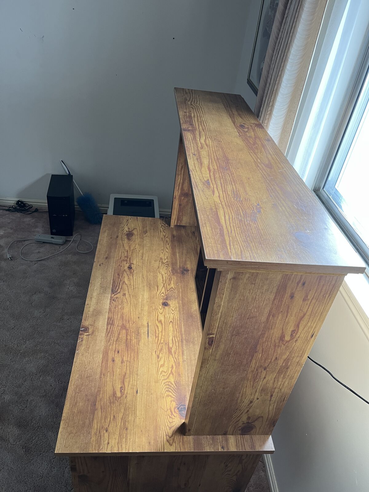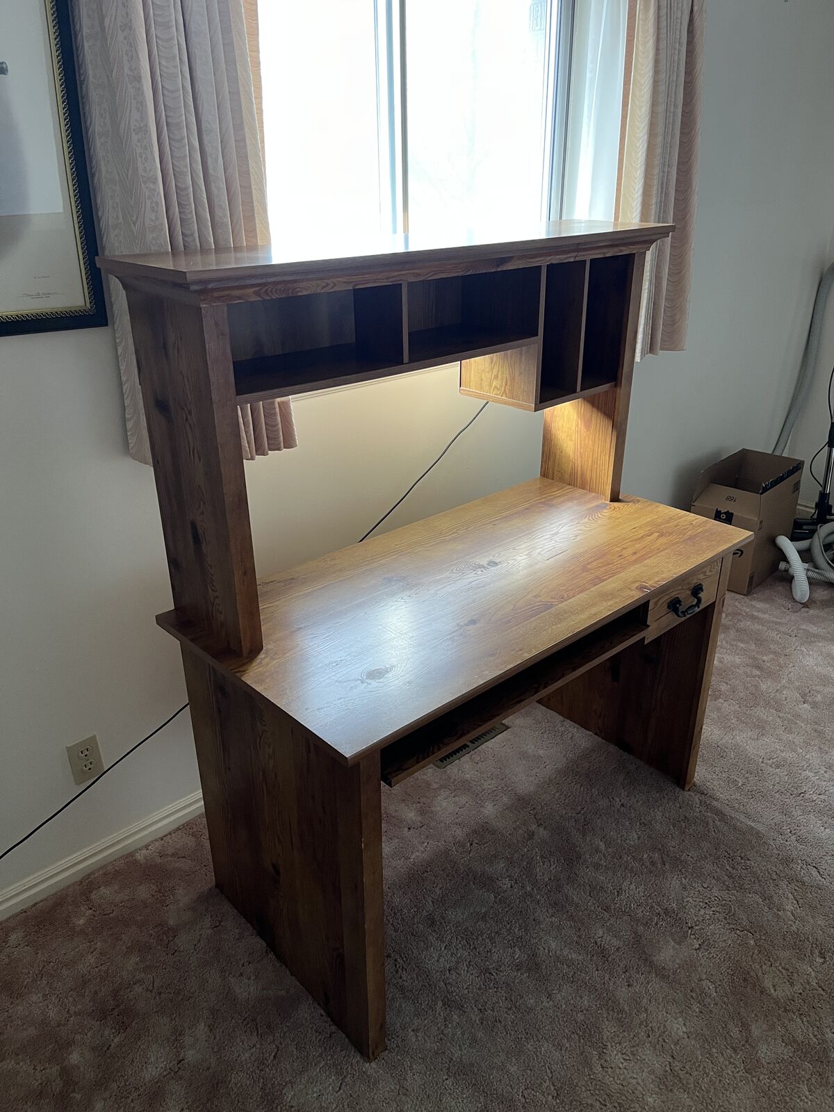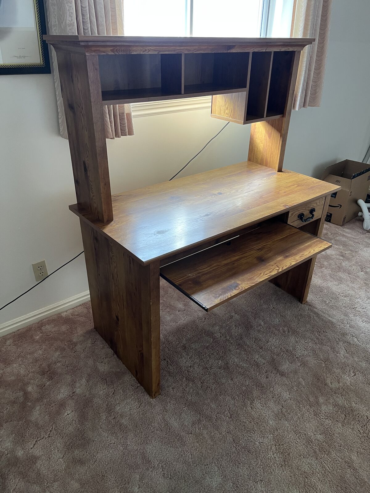 ApplePayWell-built home office desk with matching hutch, perfect for a computer setup, writing desk, or student workspace. Made in the early 2000s and in great shape—clean, sturdy, and ready to use.