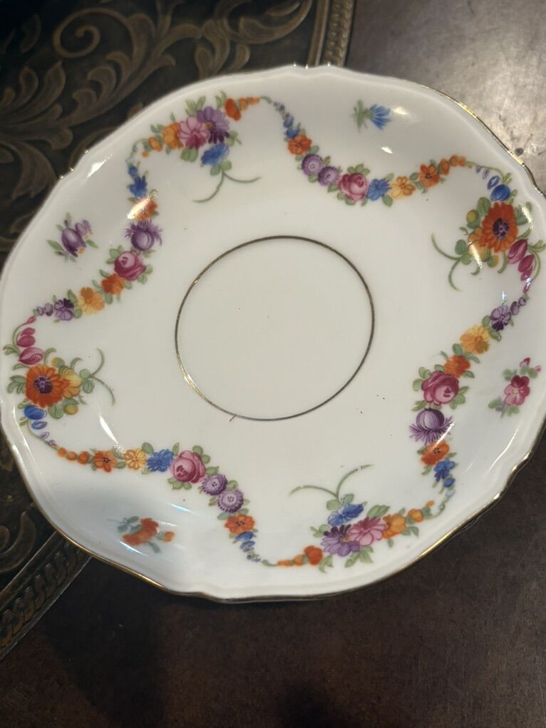 It even a country anymore. Beautiful 6”. 4 saucers. Floral swag decor. Vintage .