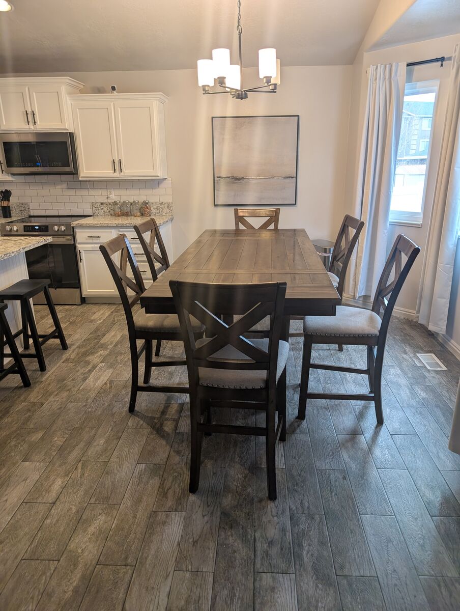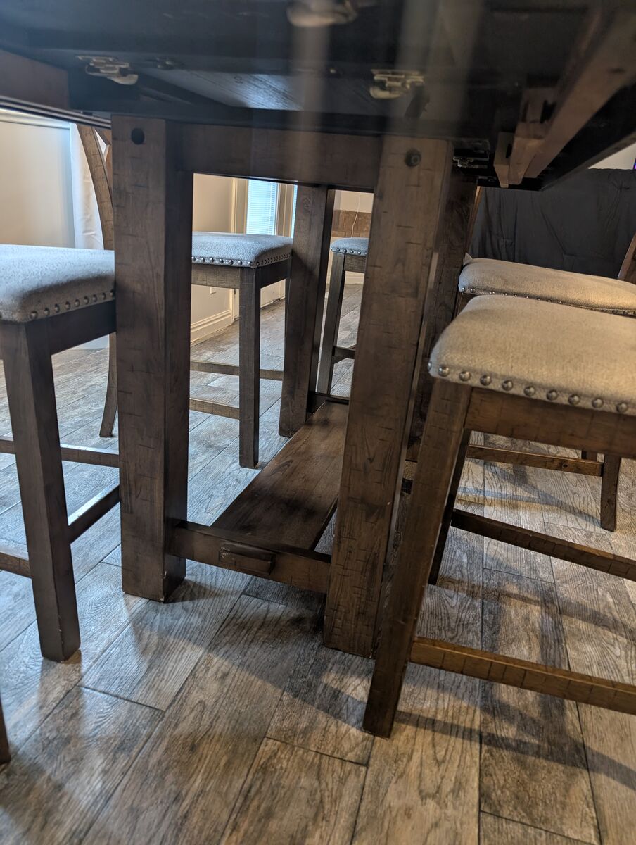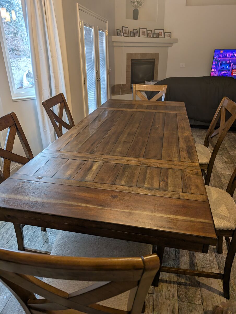 Ashley Dining table with 6 chairs. Is in a great condition always been protected with a plastic cover. It has a few small dings like you can see in the pictures. I pay $1700 about 4 years ago asking $850 obo Dimensions are 86x36. One chair is missing the foot rest