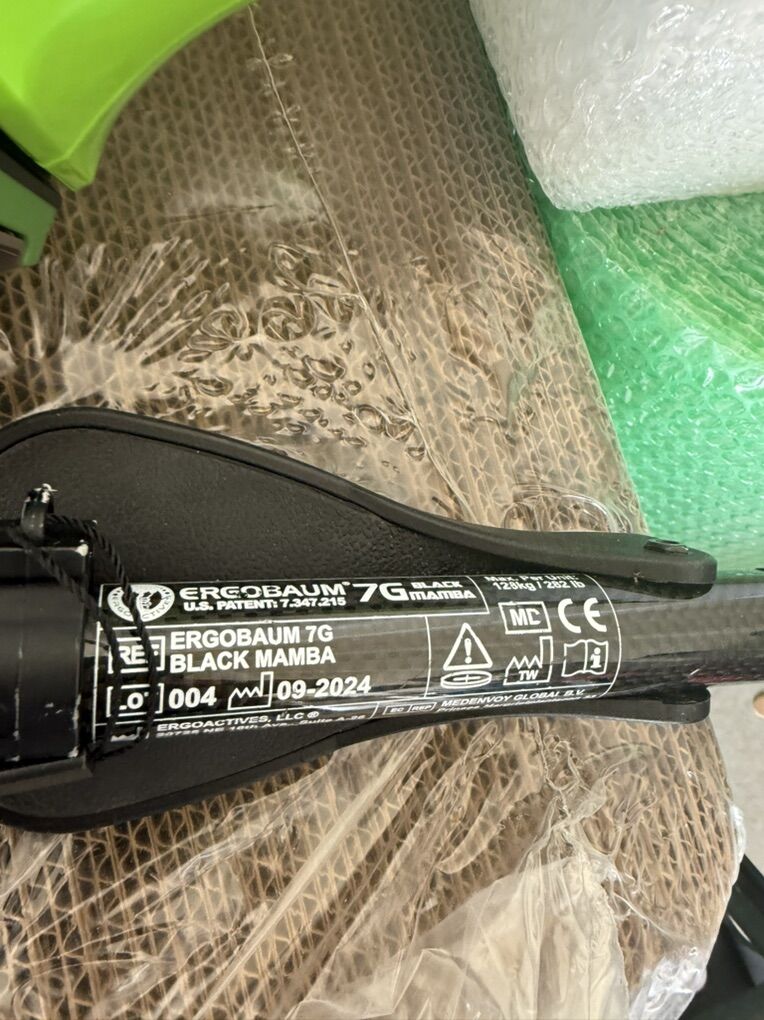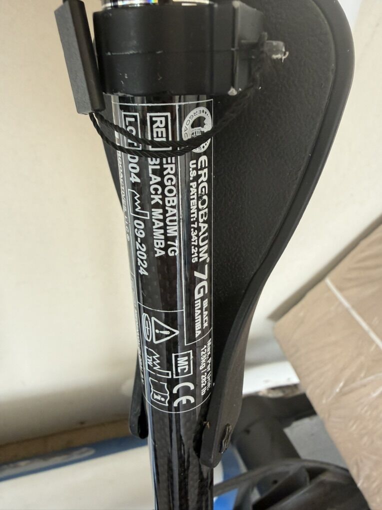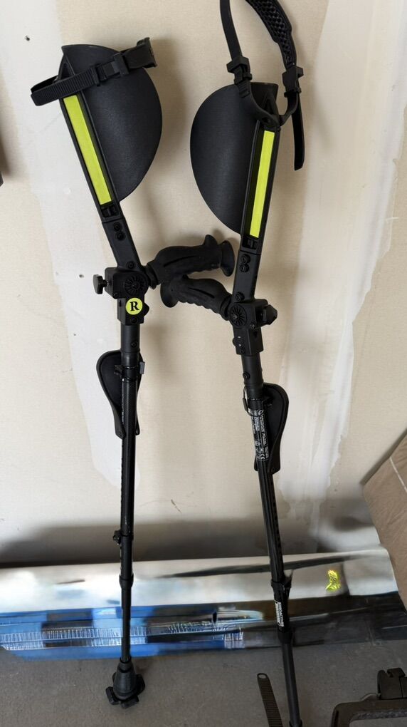Venmoa pair of Ergoactives Ergobaum 7G ergonomic forearm crutches. Designed by an orthopedic surgeon to provide comfort and shock absorption. Feature fully adjustable height, forearm length, and an ergonomic grip. Include a built-in LED flashlight and a safety alert horn for enhanced visibility and safety. The design incorporates an integrated padded knee rest to relieve pressure during extended use. Suitable for adults between 5' and 6'6 and support up to 350 lbs