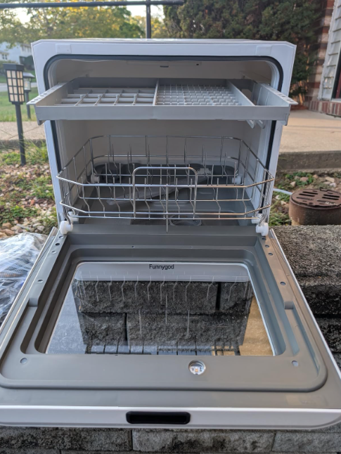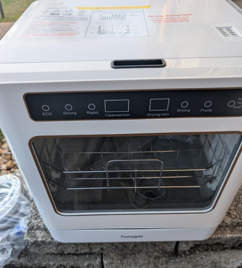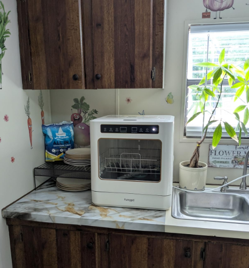 ZelleThe fully automatic dishwasher eliminates the need to wash dirty dishes by hand every day. The countertop dishwasher enhances your life's convenience. It can be easily placed even in a small kitchen, provided that there is at least 19.88 inches (about 49 centimeters) of space between the countertop and the wall cabinet. It can be used in various scenarios such as apartments, RVs, restaurants, and offices. This portable dishwasher measures 17x15.3x18.1 inches (width x depth x height) and can hold 8 pieces of cutlery, 8 plates and 8 bowls. It can clean coffee cups, small pots and pans, etc. while washing dishes and chopsticks, making it multi-functional. This mini dishwasher offers 4 washing programs and a drying function: Quick Wash (28 minutes), Standard Wash (62 minutes), Intensive Wash (93 minutes), Fruit Wash (15 minutes, no heating required), and Drying & Disinfection (60 minutes). The dual high-pressure spray arms ensure a thorough 360° cleaning of the dishes.