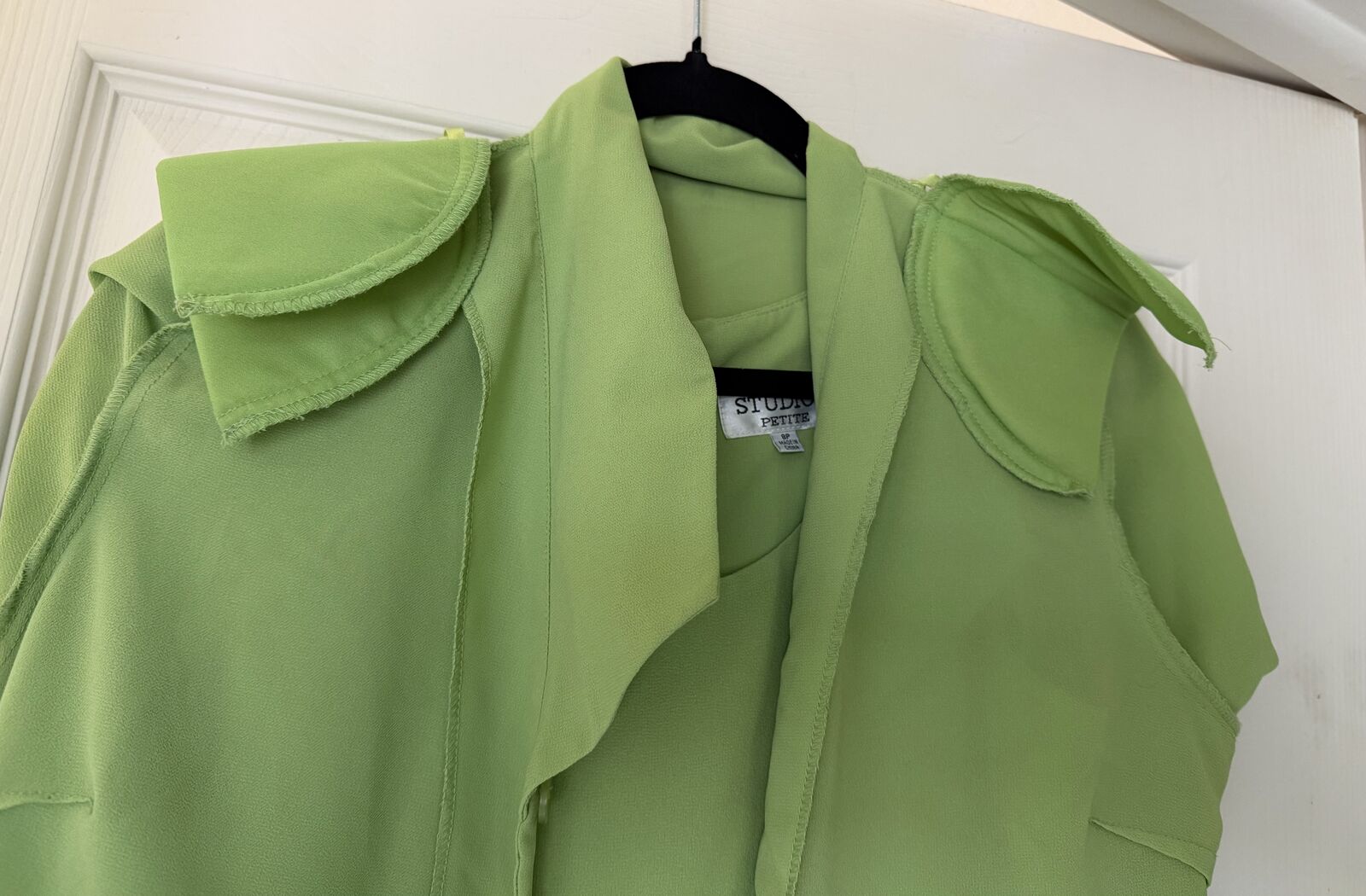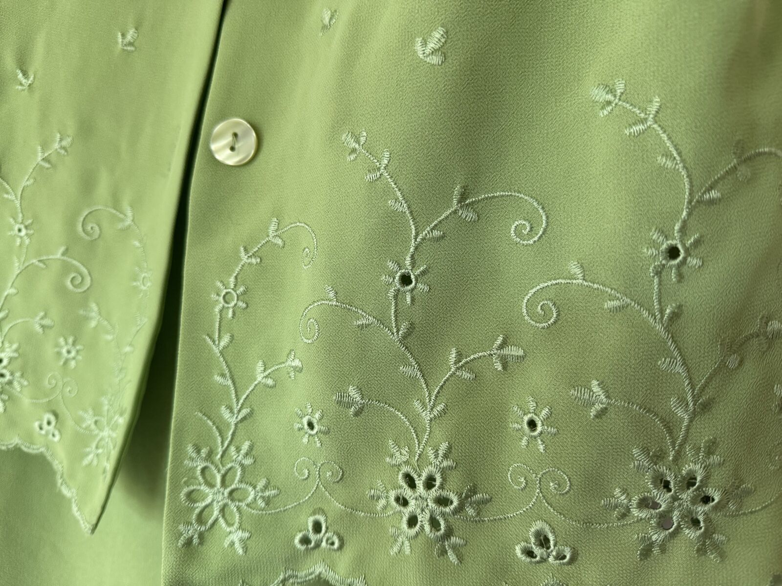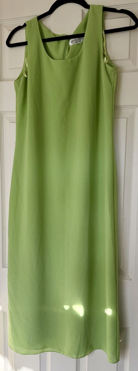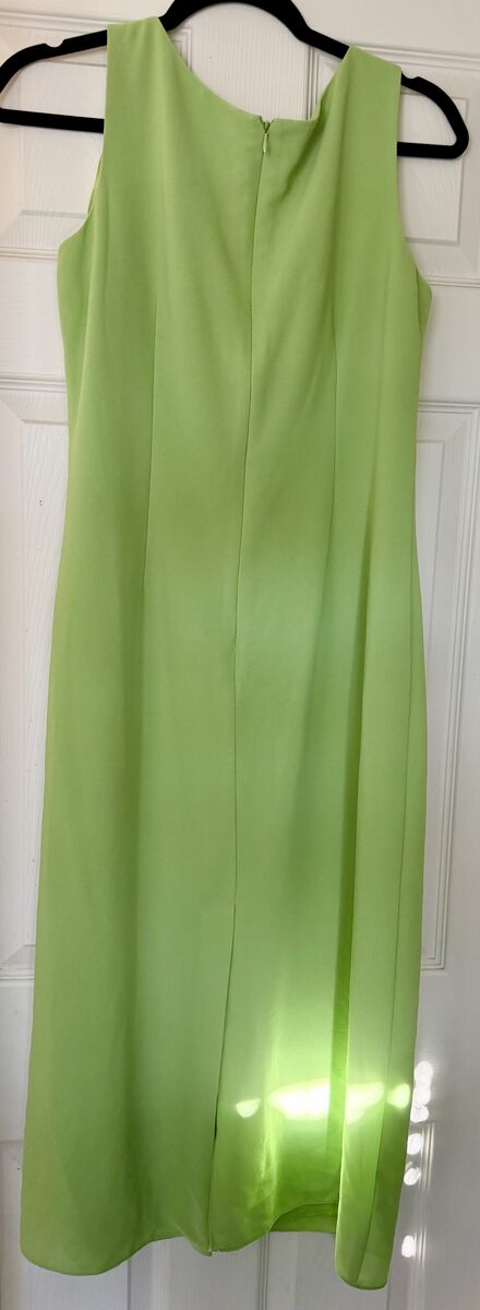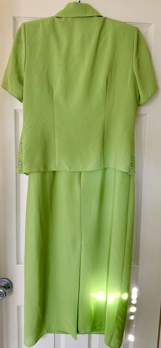 Lime green tank dress and short-sleeved jacket. Button closure on the jacket, includes shoulder pads. Dress is slip on, zipper back close. Jacket has embroidered floral design. In excellent condition; worn only once.