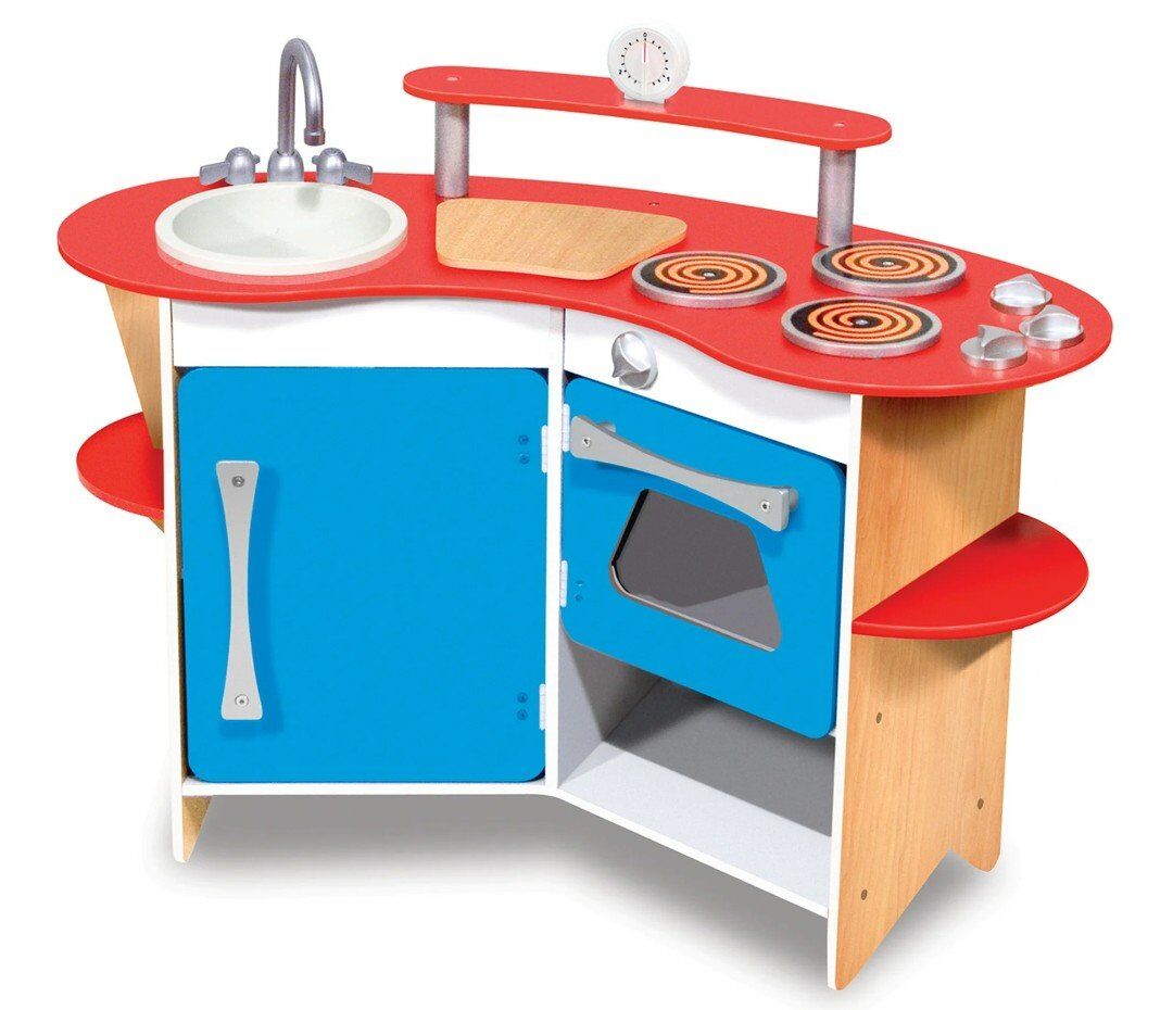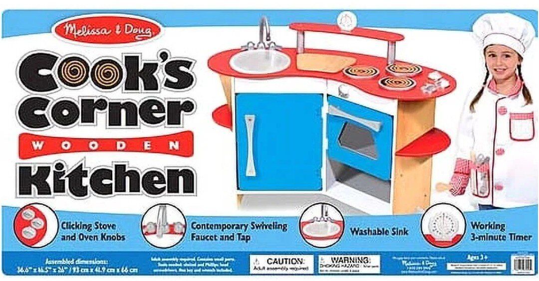 Afford your little one hours of imaginary play with this Cook's Corner wooden kitchen from Melissa & Doug. The cutting board and three-burner cooktop let your favorite little chef prepare creative meals for hours on end. A refrigerator with storage shelves provides plenty of space for pretend food, while a working timer and clicking oven knobs allow for realistic play.